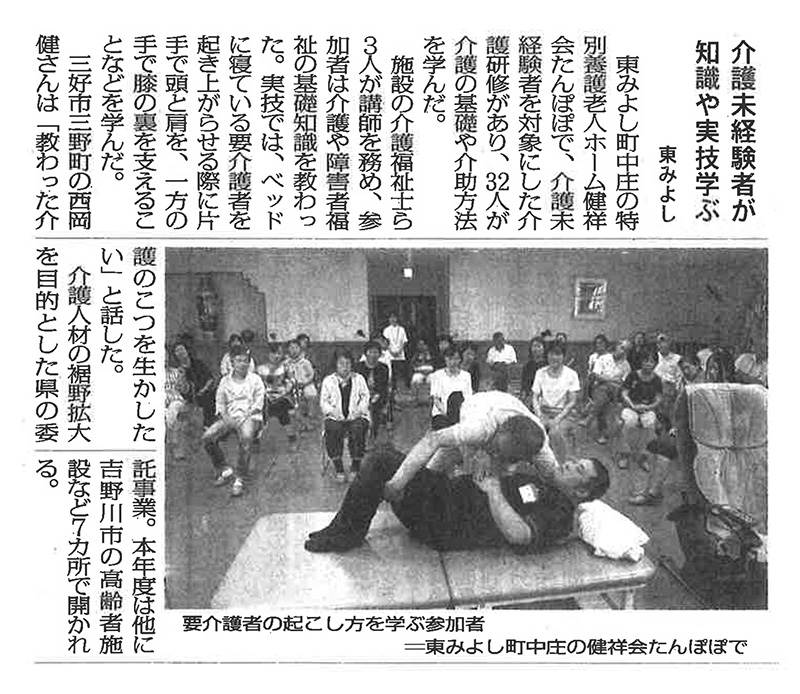 この記事は公開から1年以上経過しています メディア掲載記事 2019年8月4日(日) 介護未経験者が知識や実技学ぶ | 毎日新聞 ■毎日新聞(2019年8月4日朝刊掲載) [記事公開日]2019/08/14(水) 健祥会たんぽぽ 介護未経験者が知識や実技学ぶ | 毎日新聞 新しい記事 職員の子どもらが介護士の仕事体験 | 徳島新聞 古い記事 【2019阿波おどり】 世界の仲間とともに、踊る阿呆になって! 過去の記事へ