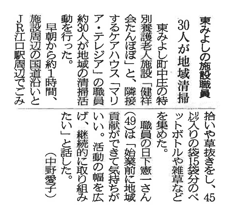 この記事は公開から1年以上経過しています メディア掲載記事 2019年8月27日(火) 東みよしの施設職員 30人が地域清掃 | 徳島新聞 ■徳島新聞(2019年8月27日朝刊掲載) [記事公開日]2019/09/03(火) [最終更新日]2020/03/24(火) マリア・テレジア健祥会たんぽぽ 東みよしの施設職員 30人が地域清掃 | 徳島新聞 新しい記事 社会福祉法人緑風会が 障がい者雇用で表彰いただきました! 古い記事 徳島県総合防災訓練に参加 「憂いあれば備えあり」の心で 過去の記事へ
