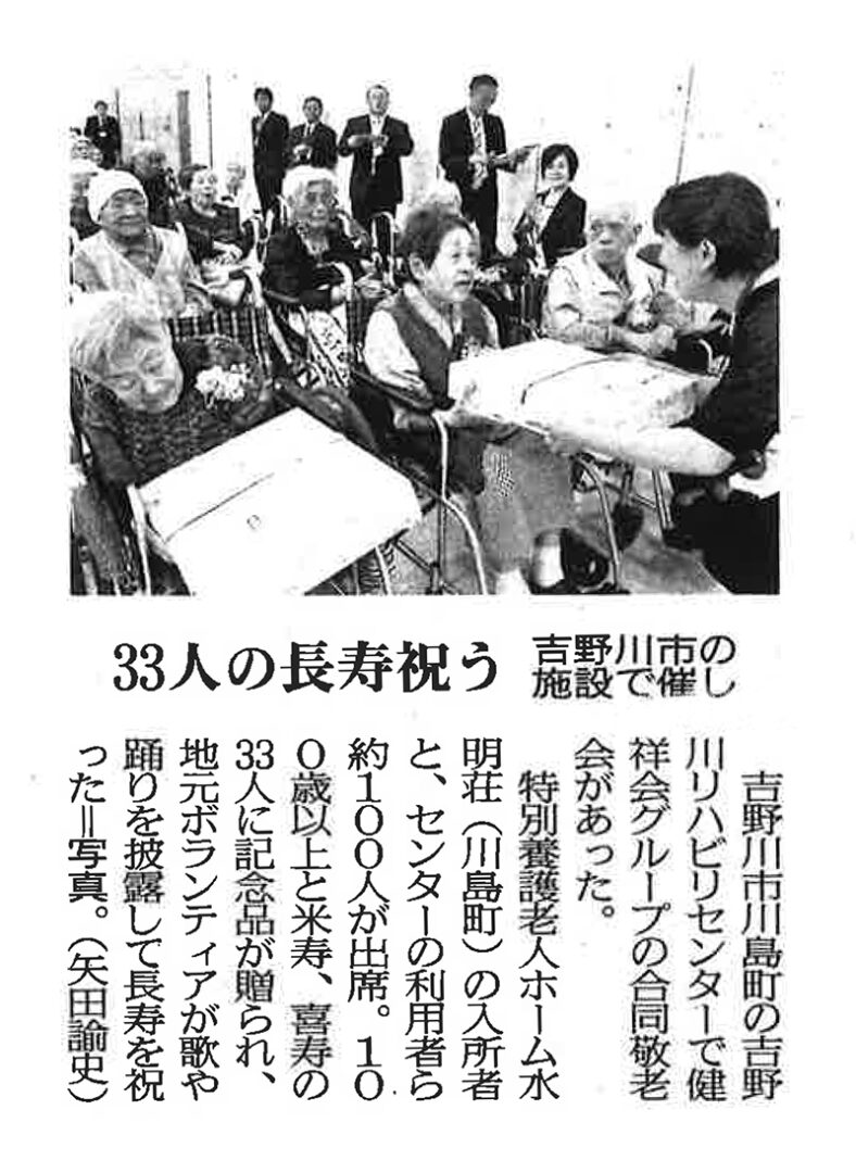 この記事は公開から1年以上経過しています メディア掲載記事 2019年9月28日(土) 33人の長寿を祝う | 徳島新聞 ■徳島新聞(2019年9月28日掲載) [記事公開日]2019/10/02(水) [最終更新日]2020/04/02(木) 吉野川リハビリセンター水明荘 33人の長寿を祝う | 徳島新聞 新しい記事 お待たせしました!オープンです! 通所リハビリテーション ヴィレッジリハビリセンター 古い記事 2外国人職員 新在留資格に 大阪の健祥会施設 │ 徳島新聞 過去の記事へ