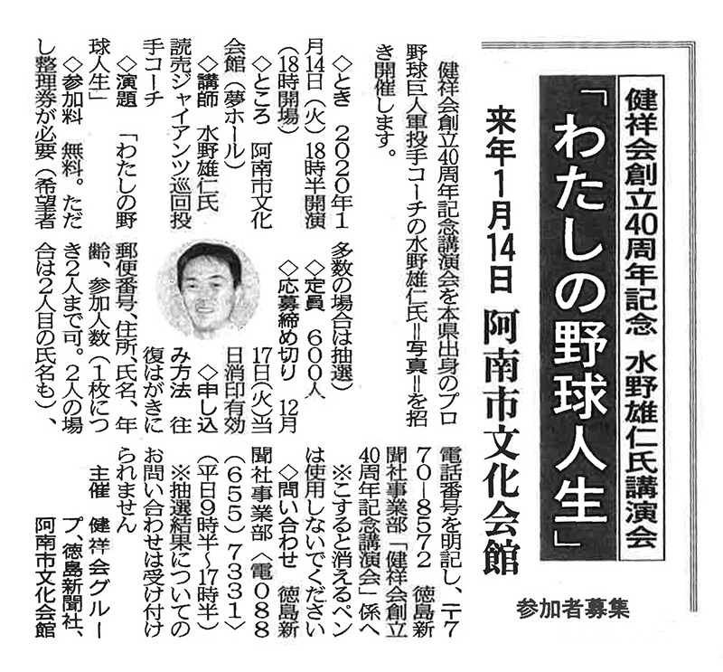 この記事は公開から1年以上経過しています メディア掲載記事 2019年11月15日(金) 健祥会創立40周年記念 水野雄仁氏講演会「わたしの野球人生」 | 徳島新聞 ■徳島新聞(2019年11月15日掲載) [記事公開日]2019/11/22(金) 健祥会創立40周年記念 水野雄仁氏講演会 「わたしの野球人生」 | 徳島新聞 新しい記事 食の質の追求は永遠のテーマ 創意工夫を競い合う料理コンテスト開催 古い記事 健祥会創立40周年記念 水野雄仁氏講演会「わたしの野球人生」 来年1月14日 阿南市文化会館 参加者募集 過去の記事へ