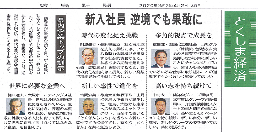 この記事は公開から1年以上経過しています メディア掲載記事 2020年4月2日(木) 新入社員 逆境でも果敢に | 徳島新聞 ■徳島新聞(2020年4月2日朝刊) [記事公開日]2020/04/02(木) 新入社員 逆境でも果敢に | 徳島新聞 新しい記事 人生の礎を豊かに育みましょう! 4園に86名のお友達を迎えて 古い記事 コロナ厳戒 前向く春 | 徳島新聞 過去の記事へ