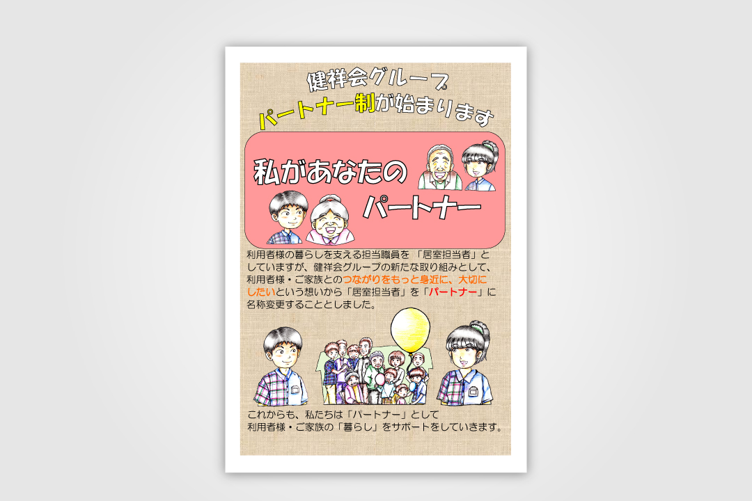 健祥会グループの高齢者施設で、これまでの「居室担当者」という事務的な呼称を「パートナー」に変更しました。呼び方そのものからもぬくもりを感じていただき、あたたかな関係性をこれまで以上に大切に紡いでいこうというものです。利用者様やご家族、職員、それぞれの気持ちがぐっと近くなることを願って。プロの技と家族の心で、高品質なケアとあたたかな日常のサポートをさせていただきます。