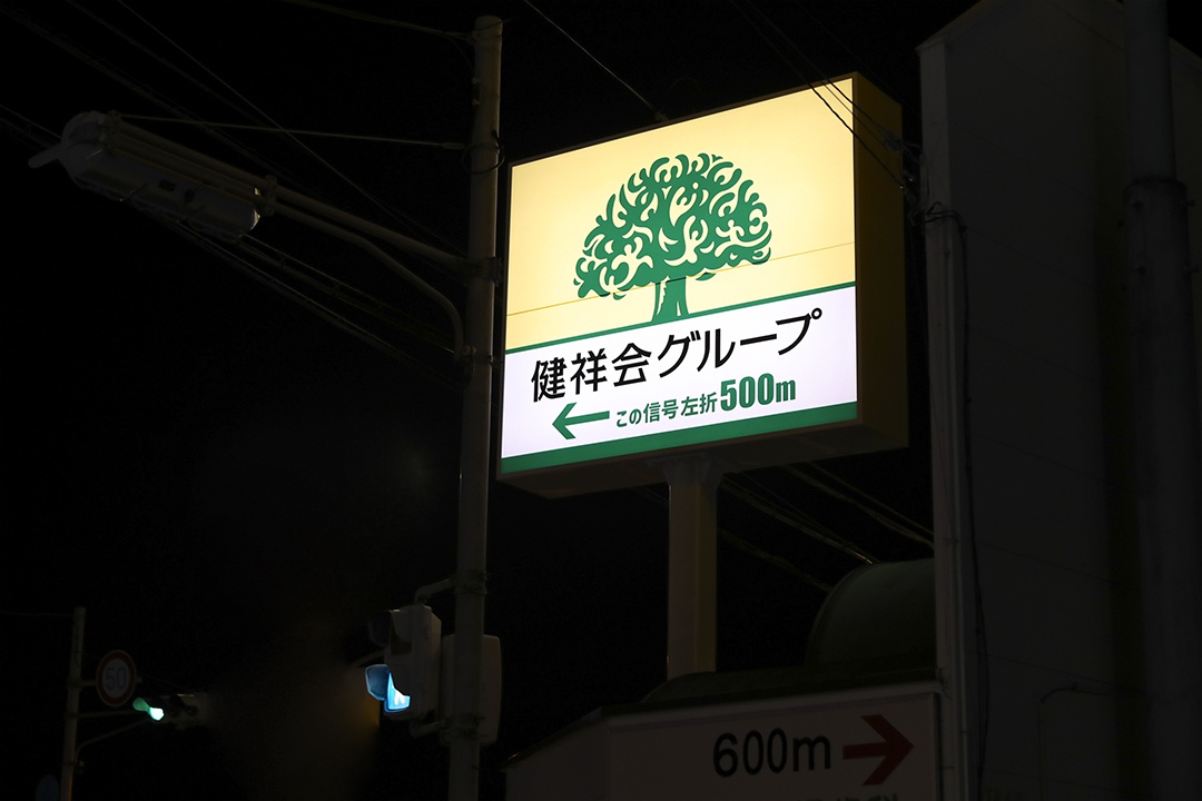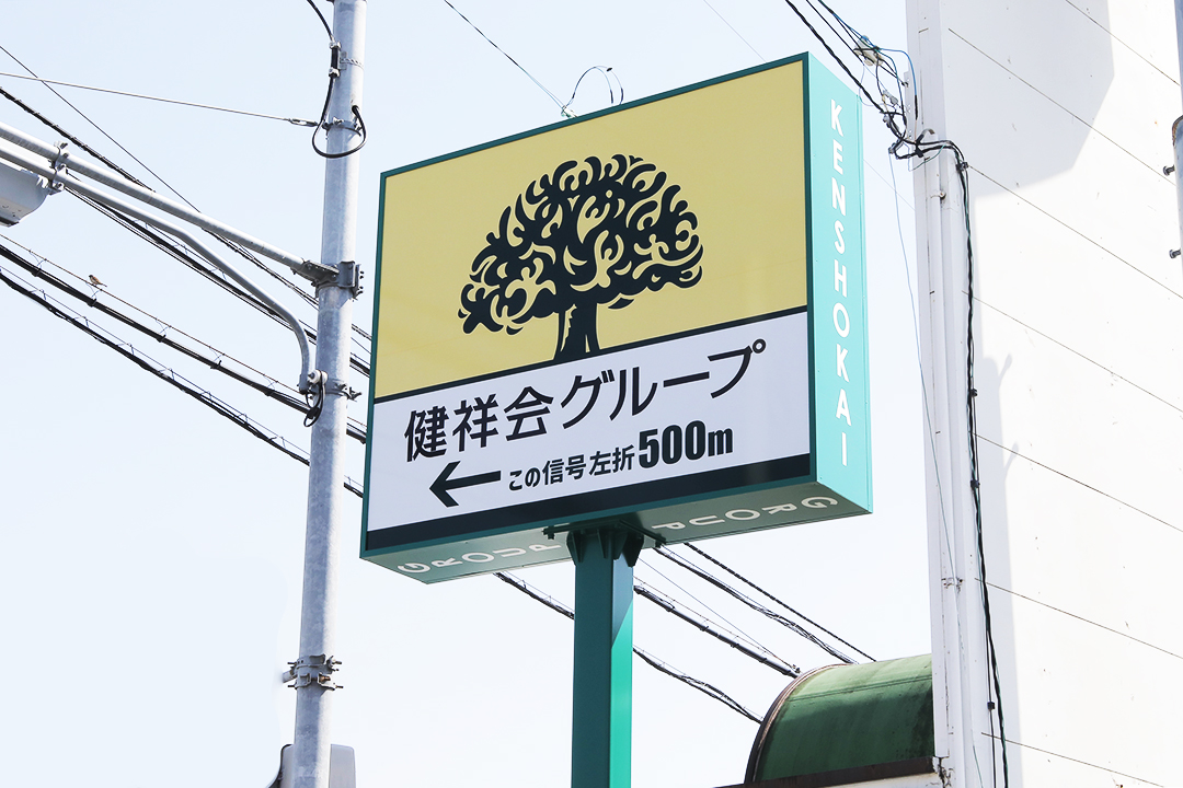 健祥会グループ本部の場所が少しわかりにくいとのお声を受け、国府町、県道30号(徳島鴨島線)に、曲がり角を示す看板が設置されました。徳島市内からいらっしゃる方はこの看板のある交差点を右折、石井・鴨島方面からの方は左折で、グループ本部をはじめとした周辺施設にアクセスしていただけます。夜はLEDでライトアップされており、遠くからでもよくわかります。看板を目印にお越しください。