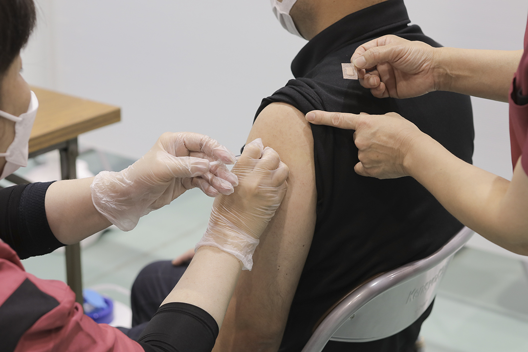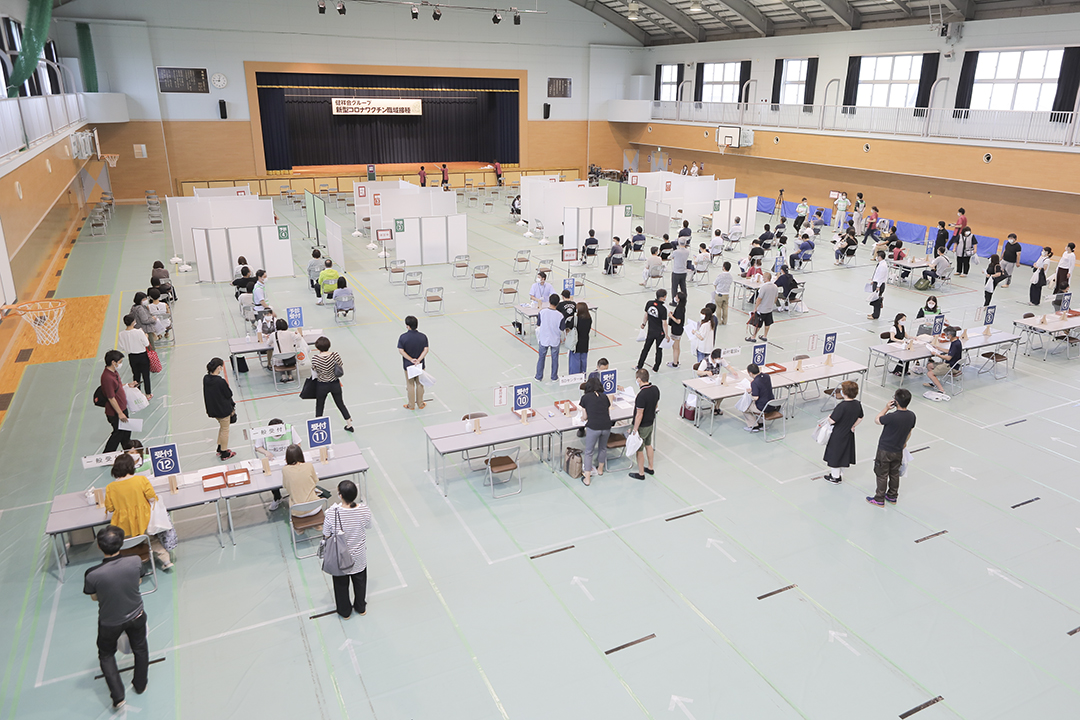 会場では本部職員が誘導係を務め、午前の3レーン・午後の4レーンとも混雑なく、混乱なくすすみ、無事初日を終えました。今日接種を済ませた人は4週間後の8月5日に2回目の予定です。
