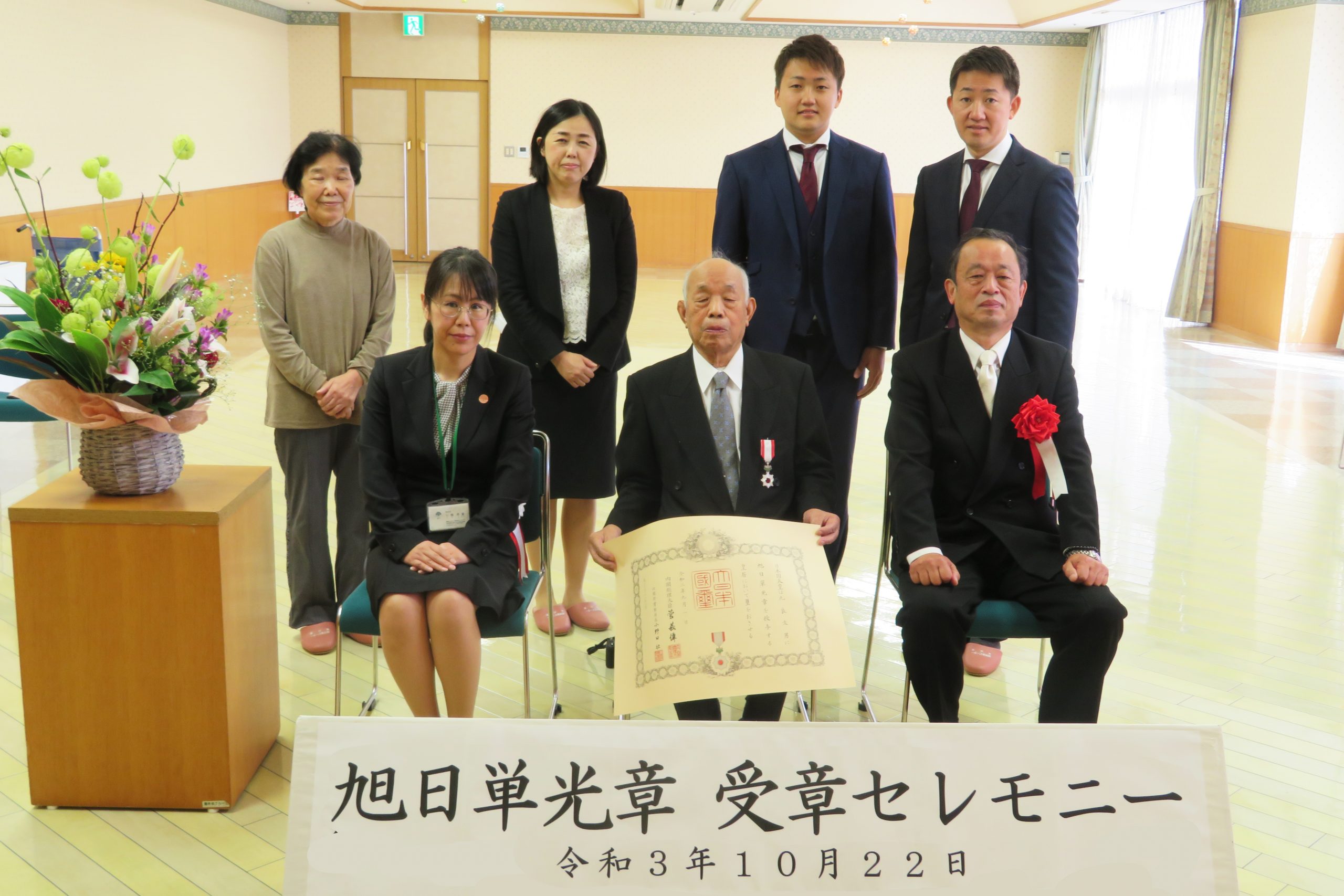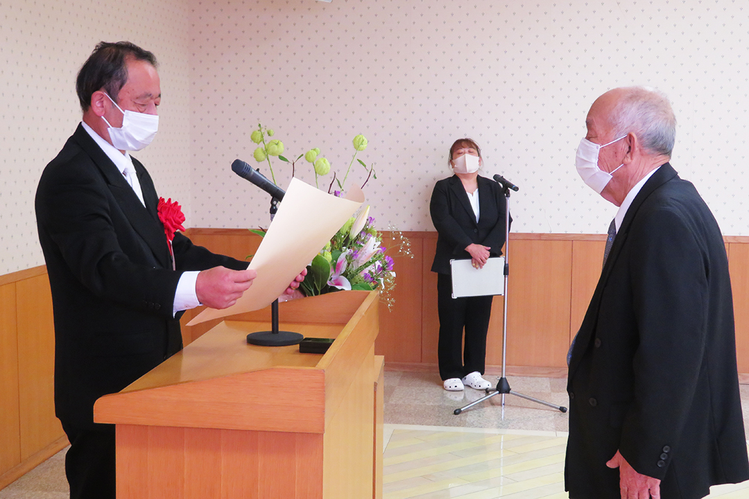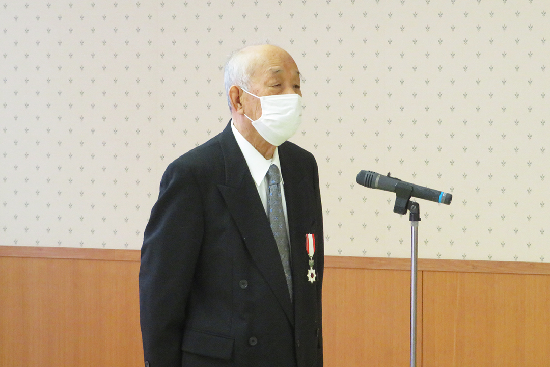 上勝町より、花本町長、細束参事兼総務課長、田村事務主任が来設くださり、九良様へ勲記と勲章が手渡され、セレモニーでは町長より叙勲へのお祝いが述べられました。