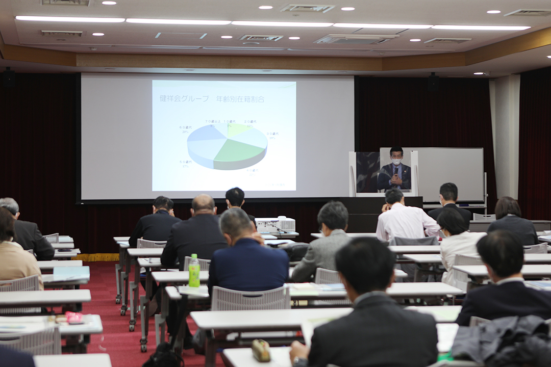 このセミナーにおいて、特別養護老人ホーム笑顔施設長矢野宏行が事例発表の機会をいただき、「シニア世代が働き続けられる職場づくり」と題して、健祥会グループの現状をお話ししました。