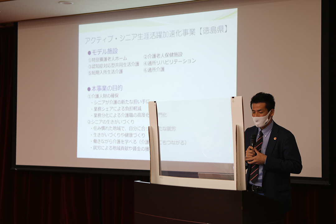 発表では、●健祥会グループ職員の年齢構成が60歳代20%、70歳以上8%にのぼっている現状 ●徳島県のアクティブ・シニア生涯活躍加速化事業により、OJTを経て介護人財確保につながっていること ●シニア人財の採用のメリット ●離職防止・人財定着に向けた取り組み などを紹介しました。