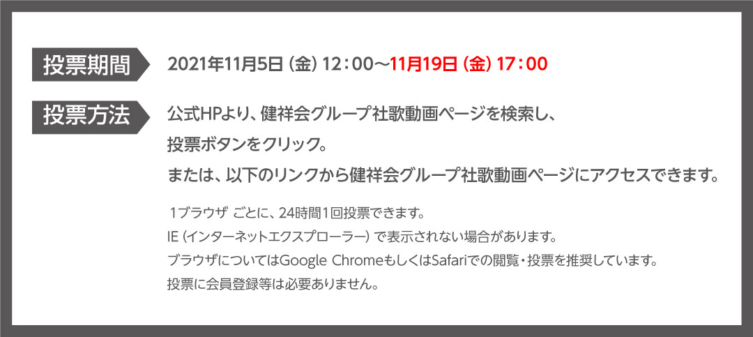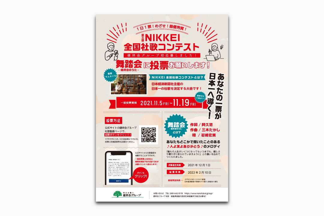 健祥会グループがエントリーしている日本経済新聞社主催の「第三回NIKKEI全国社歌コンテスト」の一般ウェブ投票が11月5日(金)12時、スタートしました。