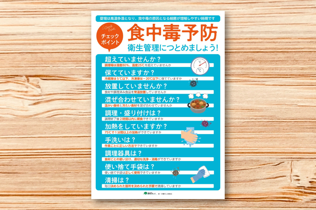 食中毒の予防には、原因になる細菌やウイルスを「つけない、増やさない、やっつける」が3原則。管理栄養士、栄養士、調理員らの厨房職員が食中毒予防に関する知識を再確認するとともに、10のチェックポイントをまとめたポスターで注意を喚起し、食材や調理器具、厨房設備の衛生管理の徹底や普段の業務のあり方の見直しも行います。資料や動画を使って各施設で話し合う機会も設けています。