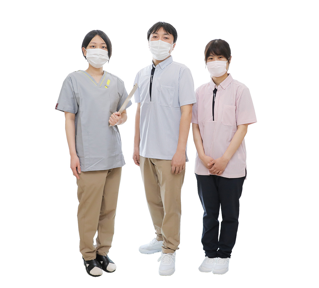 グレーのシャツは管理栄養士。利用者様に職種の違いがわかるように、機能性は同じで別デザインとしました。