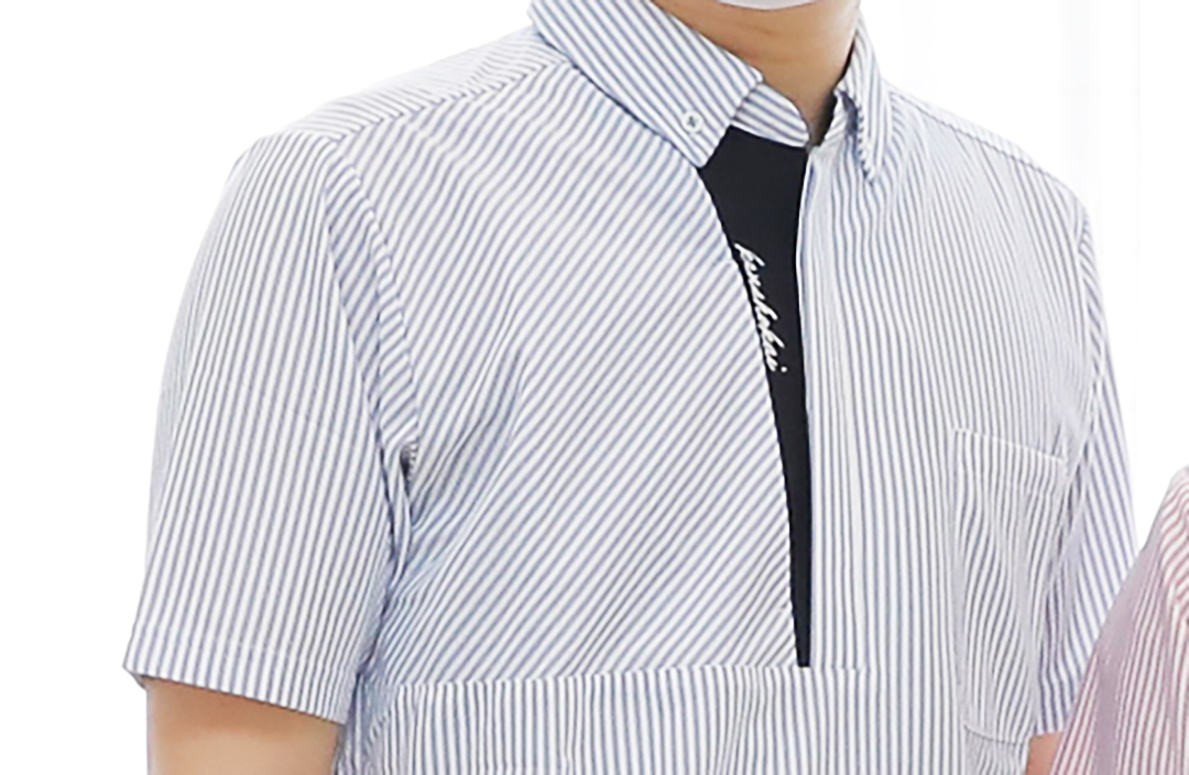 ケアワーカーのシャツはピンクと青の細いペンシルストライプ。ジェンダーフリーで好きな色を選べます。胸元の短冊開きの内側は紺色で。【kenshokai】と刺繍が施され、右前身頃のバイアス使いとともにほどよいアクセントになっています。軽く柔らかく、着心地よく、動きやすく、優れた吸汗速乾性能を持つ素材です。洗濯機でじゃぶじゃぶ洗えるのも魅力。後身頃が長く、しゃがんでも腰やおしりが隠れる嬉しいデザインです。