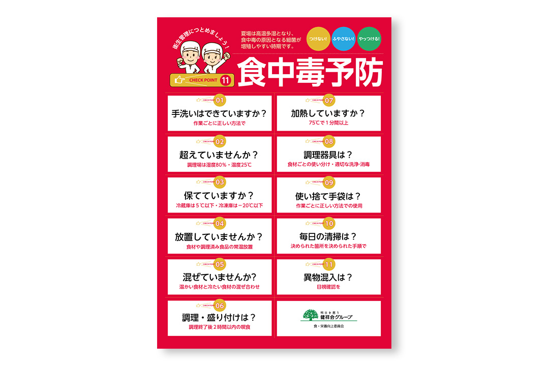 恒例の啓発ポスターを厨房に掲示。今年は赤を基調とし、11のチェックポイントを示して、管理栄養士、栄養士、調理員ら厨房職員の注意を喚起します。
