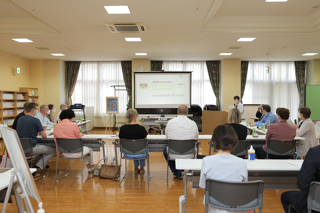 健祥会グループからは本部長関久代が、健祥会とドイツのご縁について触れながら歓迎の挨拶。日本の高齢化の現状や介護の課題、健祥会の取り組みを紹介するとともに、人としてのあたたかな心で人にしかできない介護を、先進技術との融合により実践していることをご説明しました。