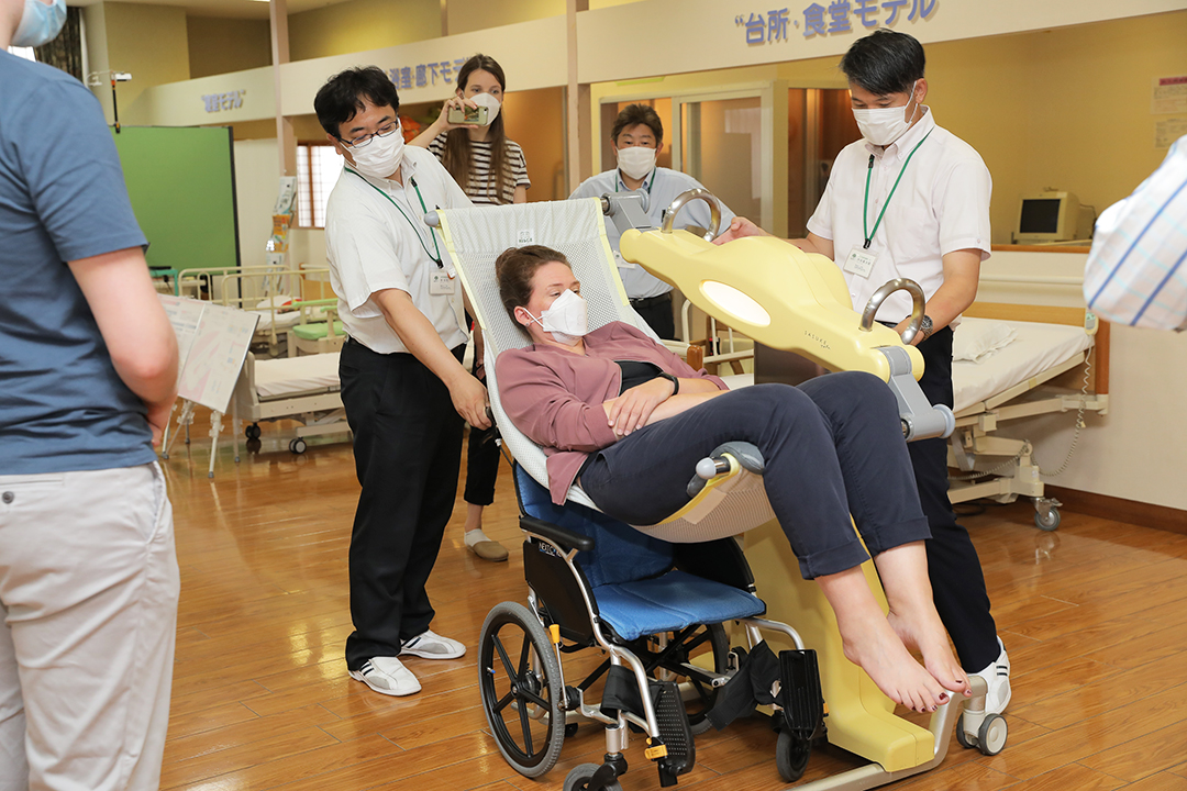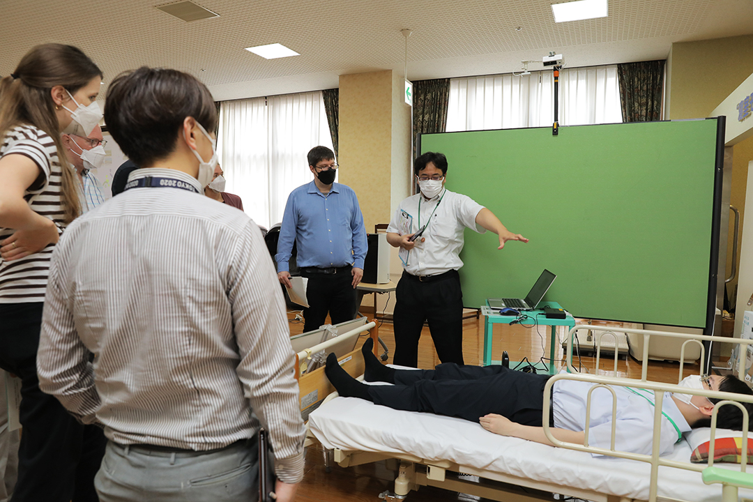 一行はまず健祥会プレゼンテーションで、介護機器を見学。移乗介助・移動支援・排泄介助・見守り・コミュニケーションなど、さまざまな種類の介護ロボットについて、展示を見ながら担当職員から説明を受けました。移乗支援ロボットでベッドから車椅子への移乗を体験したり、見守りセンサー付きのベッドに横になり送られるデータを確認したり、アシストスーツを装着したり、どなたも非常に熱心に見学・体験をしてくださいました。