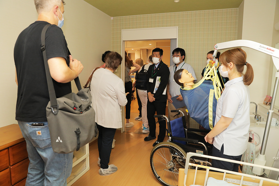 また、ドイツでは介護職がロボットを使いたがらず、二人介助が日常的になっているという現状が紹介されました。これを受け、日本でも時間がかかることなどから導入時には現場は戸惑ったりするが、利用者様の安全のためだけでなく介護者の腰痛予防にも大きな役割を果たす上、介護職一人で担うことで一人に余裕が生まれ、利用者様に寄り添う時間が増えて介護の質向上につながることから、施設長が音頭をとって利用を推進していると説明。一行は、開放的で家庭的なユニットケアにも好印象を持たれたようでした。