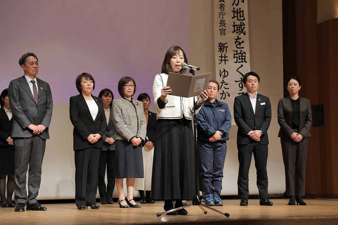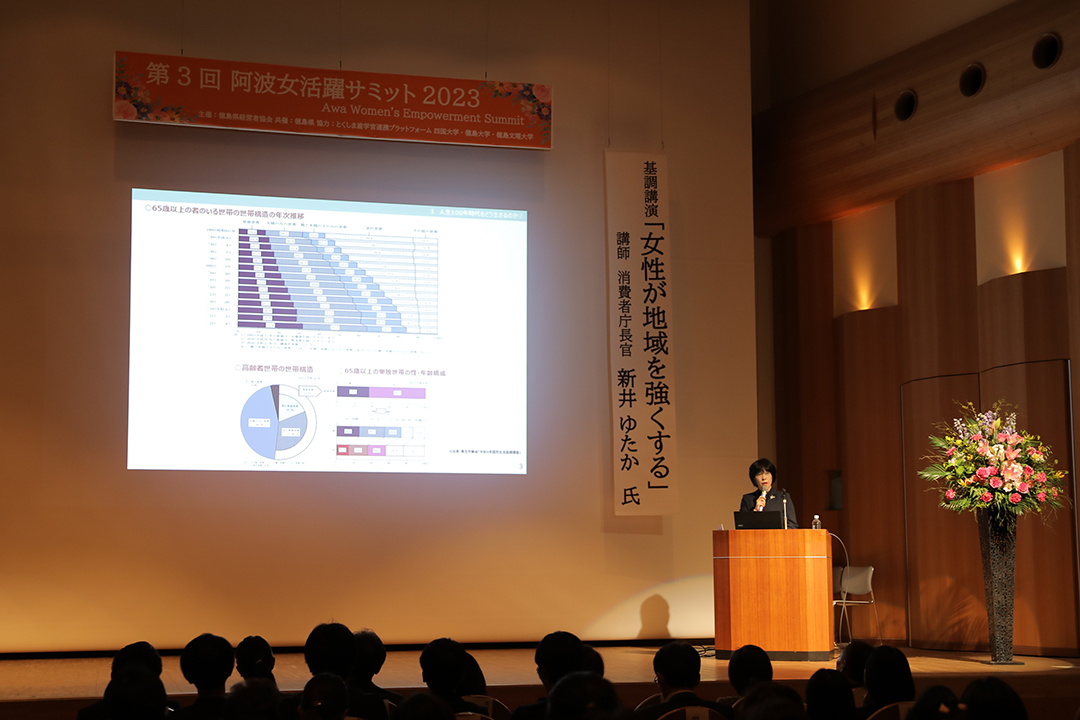 基調講演では消費者庁長官新井ゆたか氏が、「女性が地域を強くする」と題して女性の活躍の重要性を語りました。