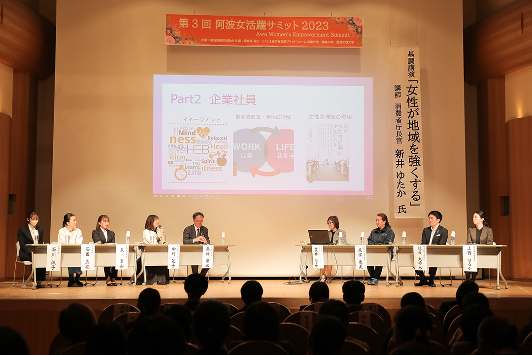 女性経営者・管理職者比率が全国トップクラスの徳島県。イキイキと頑張る徳島の女性がさらに輝くことのできる環境を創出し、徳島経済の活性化を図っていこうという趣旨のもと第3回阿波女活躍サミットが、アスティとくしまブライダルコアときわホールを会場に開催され、健祥会グループ常務理事中村晃子がパネリストとして登壇しました。