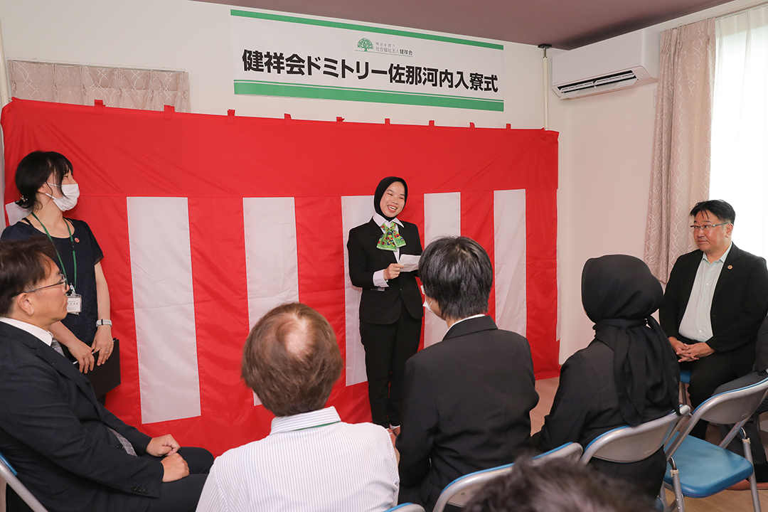 理事長・施設長の挨拶に続き、ヌル アダウィヤー ハシブアンから、「理事長はじめ職員の皆さんのおかげですばらしい職員寮に住むことができます。心から感謝します。ここは安心して快適に過ごすことのできる大切な場所、本当に嬉しいです。ここで新しい生活をスタートさせ、勉強に仕事にさらに頑張りたいと思います」と挨拶がありました。