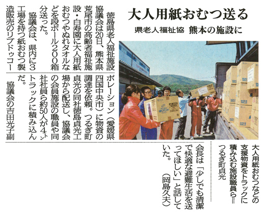 徳島県でも、徳島県老人福祉施設協議会が、大人用紙おむつやぬれタオルなど、避難所で不足が叫ばれている物資を調達し、熊本県の高齢者福祉施設へ届けることになり、20日、健祥会グループウエストⅠ・Ⅱステージの施設から職員10名が積み込み作業のボランティアに参加しました。今後も、東日本大震災や県下の台風災害などの折のボランティア経験を生かし、被災地のニーズをしっかり把握しながら、できる支援をしてまいりたいと思います。