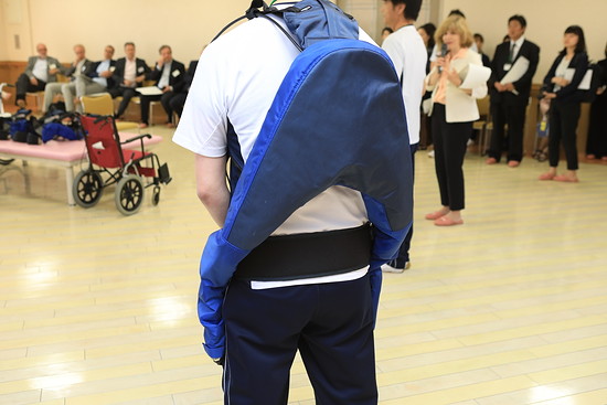 マッスルスーツは、空気圧式の人工筋肉が強い力で収縮し、これが身体を動かす原動力となり、人や物を持ち上げる際の腰や膝の負担を大幅に軽減するものです。首相らも自ら実際に装着して、立ったり中腰になったり、お互いに介助しあったりし、その効果に感心なさった様子でした。