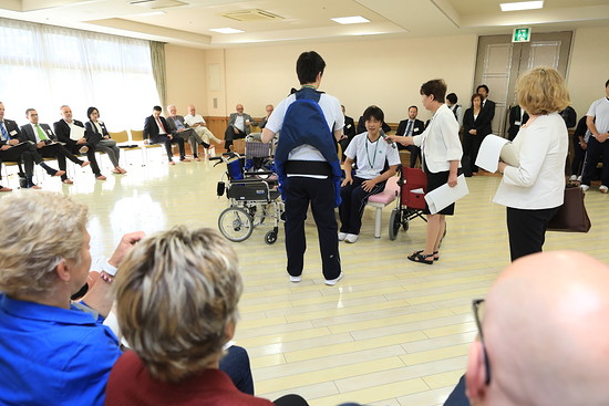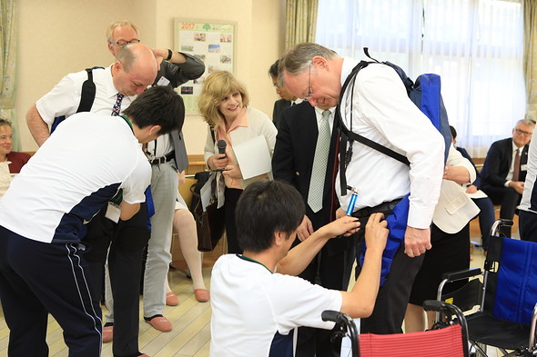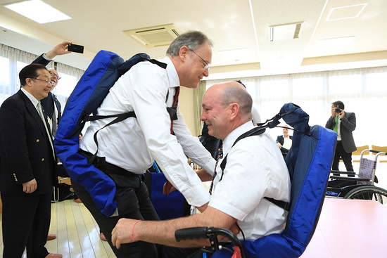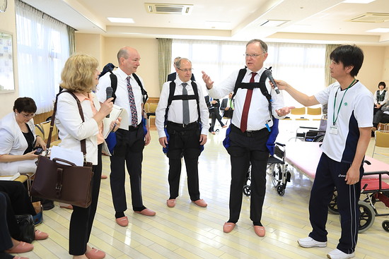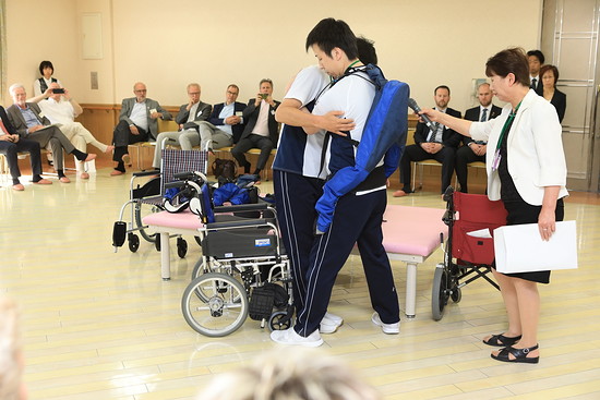 「ハノーバーの国際産業技術見本市で見た最先端の日本のマッスルスーツが、なぜここにあるのか」との質問に、介護職の負担軽減のために設けられた国の補助金により導入したことをまずご説明し、マッスルスーツを身につけて、ベッドから車椅子への移乗介助する様子をご覧いただきました。