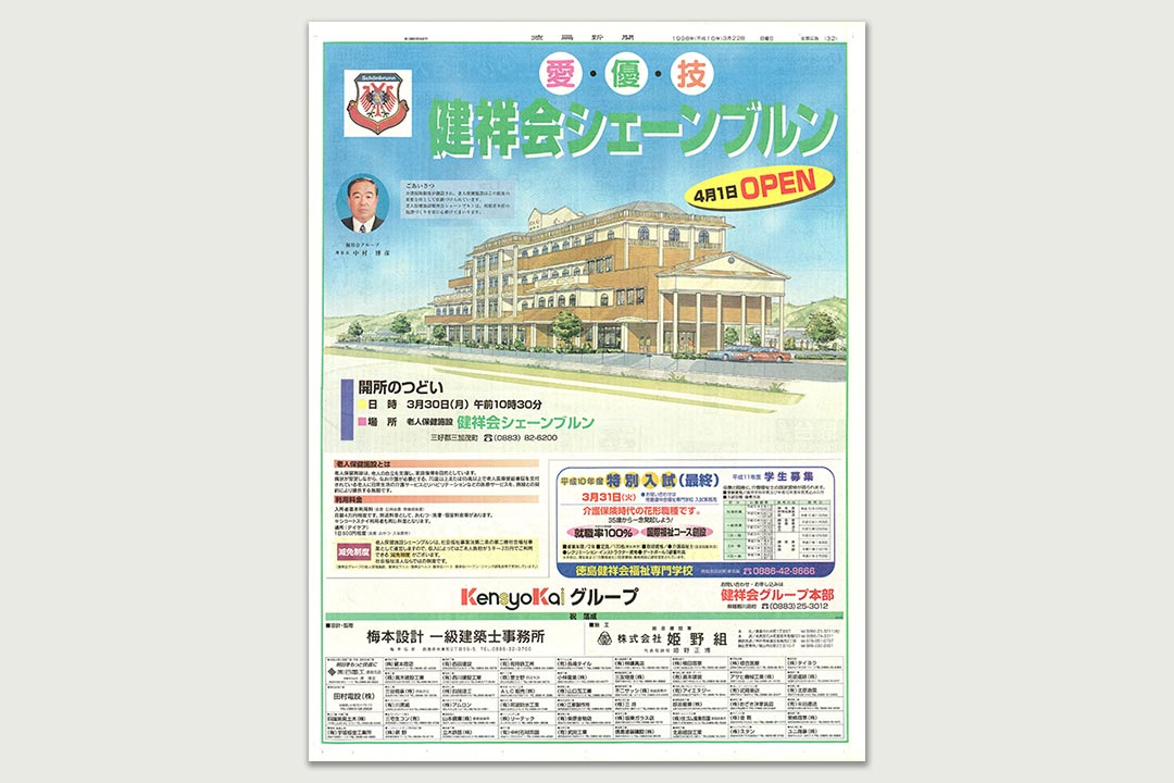 徳島の西部で誕生した健祥会も、香川・高知・大阪・京都・東京へと広がり、66施設を経営しています。先ごろ医療法人からの譲渡を受け、脇町に100床の介護老人保健施設センターヴィレッジが開所しました。西部地域の医療介護連携をさらに強固なものとし、地域包括ケアの構築に、そして地域貢献にますます力を注いでまいりますので、変わらぬご支援ご協力をお願い申し上げます。