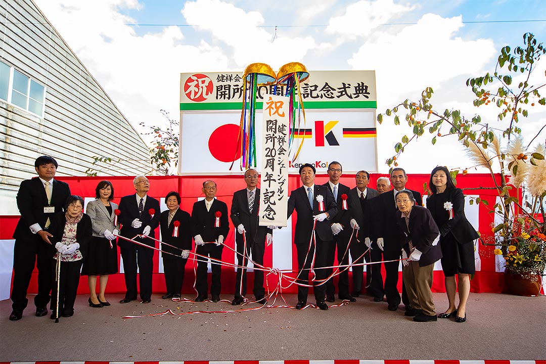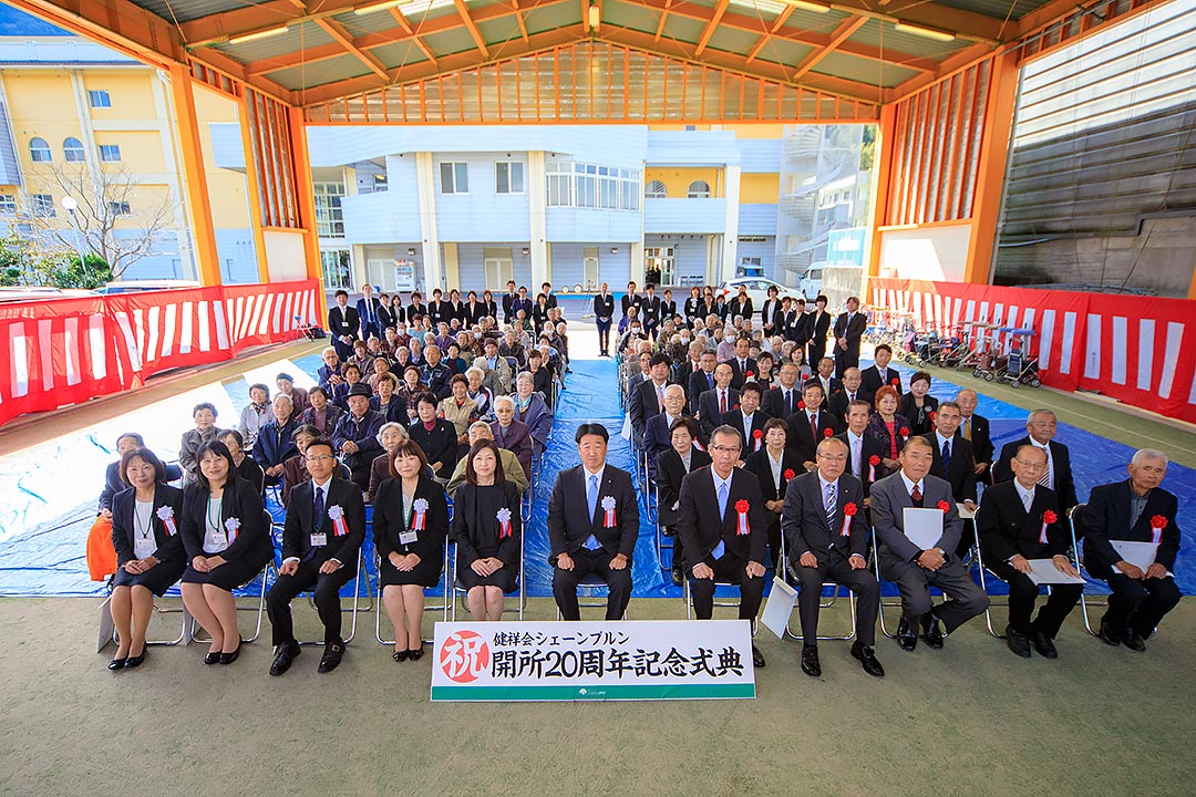 本年4月1日、開所20周年を迎えた老人保健施設 健祥会シェーンブルンで記念式典が執り行われ、東みよし副町長 川原誠男様、東みよし町議会議長 坂本正一様をはじめ、いつもご協力いただいている地域の皆様にご列席いただき、利用者様やご家族の皆様とともにお祝いしました。