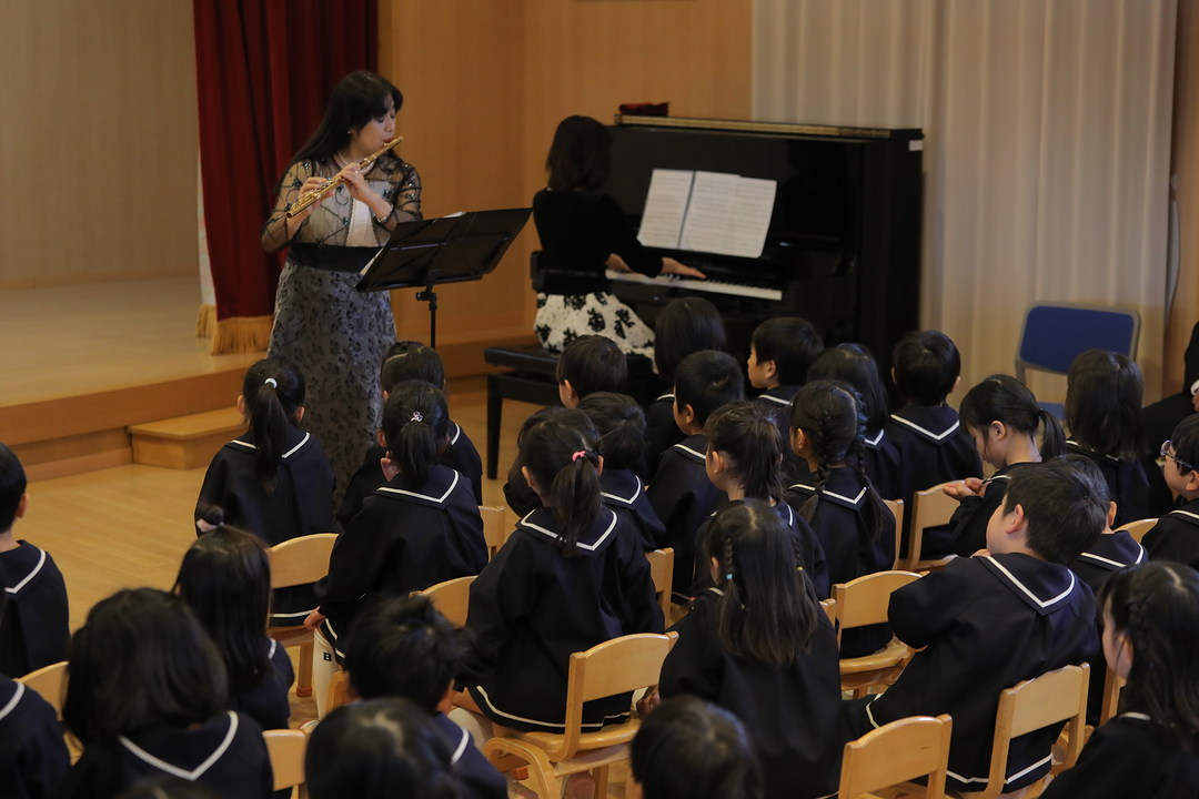 式典の後に催された記念コンサート。園歌や可愛い振り付けによる園児たちの歌、小松島中学校マンドリンクラブの皆様の涼やかな音色の演奏、音楽教室講師高橋久美子先生とフルート奏者香川雅代様によるピアノとフルートの美しい二重奏など、列席者みんなで心豊かなひとときを楽しみました。マンドリンの曲では、園児たちが歌をくちずさみ、お遊戯室にあたたかな気配に包まれました。