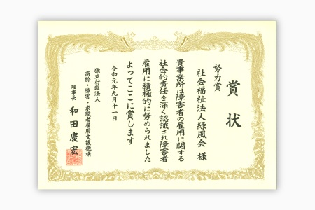 | 障害者雇用優良事業所等表彰 努力賞 高齢・障害・求職者雇用支援機構社会福祉法人緑風会 障がい者を積極的に多数雇用するとともに、永年にわたり、障がい者の雇用の促進と職業の安定に貢献した団体として表彰されました。 社会福祉法人緑風会が 障がい者雇用で表彰いただきました! | ![]() |