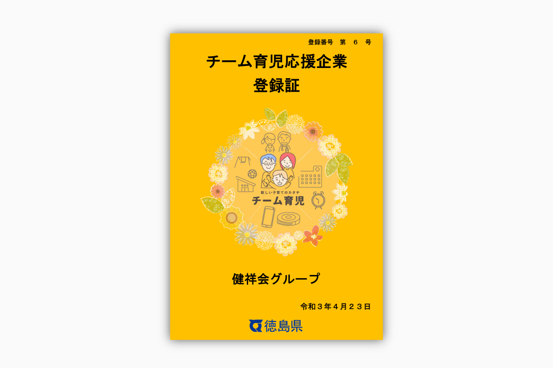 チーム育児応援企業・団体登録 徳島県健祥会グループ健祥会グループは、徳島県の提唱する 「チーム育児」の趣旨に賛同し、その普及、啓発に協力する「チーム育児応援企業・団体」として登録されました。