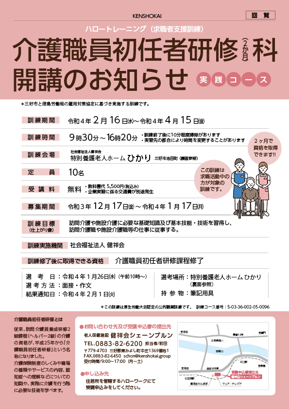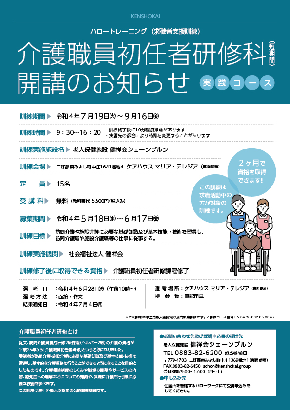 健祥会シェーンブルン「介護職員初任者研修科開講お知らせ」