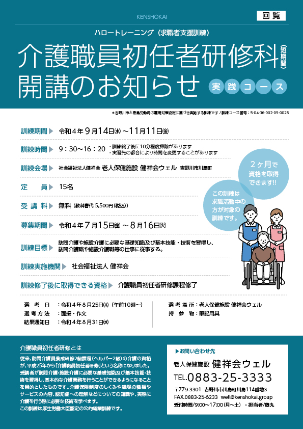 健祥会ウェル「介護職員初任者研修科開講お知らせ」