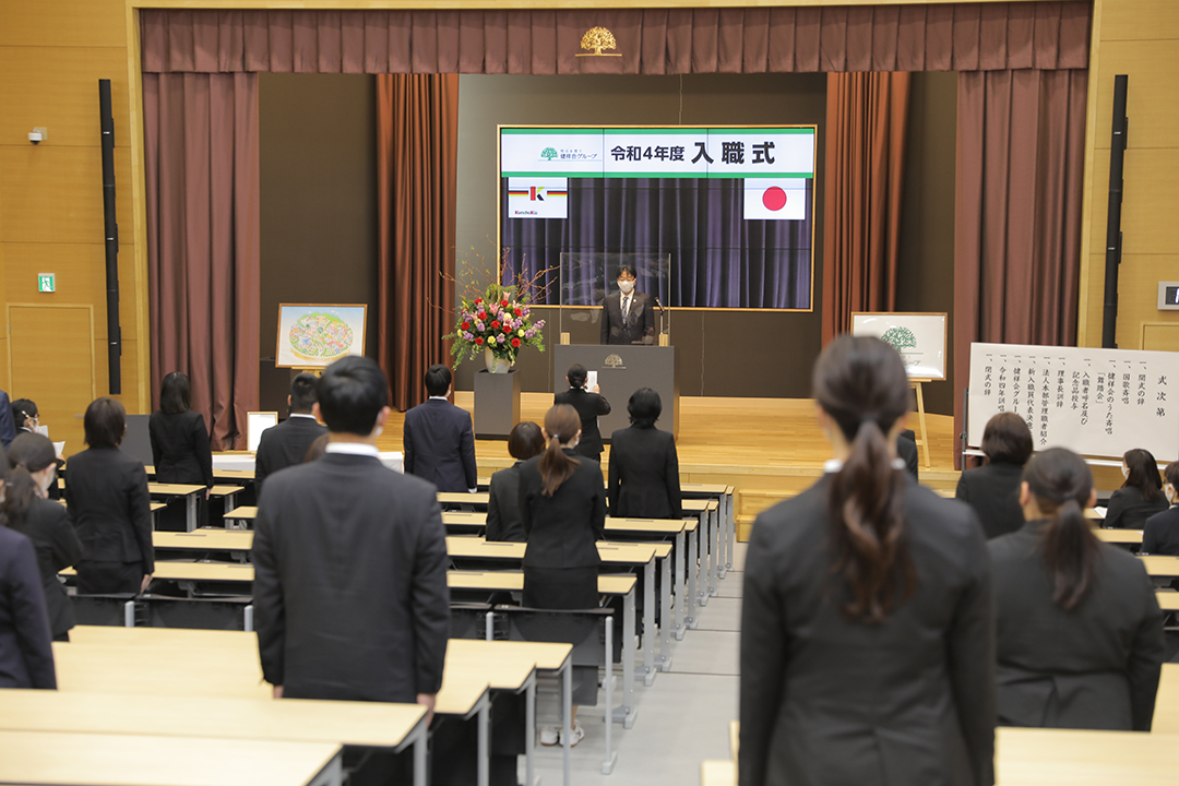 私たちにはキーワードがあります。共に創る「共創」と競い合う「競争」、前に進む「進化」と深まる「深化」です。職員同士、施設同士、ステージ同士が競い合い、高め合いながら、目の前の「いのち」に向き合い、新しい自分・新しい施設・新しいグループの姿を描き、ともによりよい健祥会グループを創っていきましょう。輝く瞳の皆さん方に心から期待します。