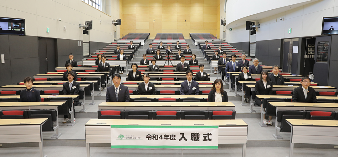 令和4年度、健祥会グループに30名の新入職員を迎えました。コロナウイルス感染症第6波がいくぶん下火になっているとはいえ、気を緩めることなく感染対策を徹底し、入職式を挙行。29名は健祥会グループ本部の健祥会トゥモローホールで、1名は京都からのリモート参加で行いました。入職者本人にとってもグループにとっても大事な節目の行事に、誰もが清々しい気持ちで臨みました。