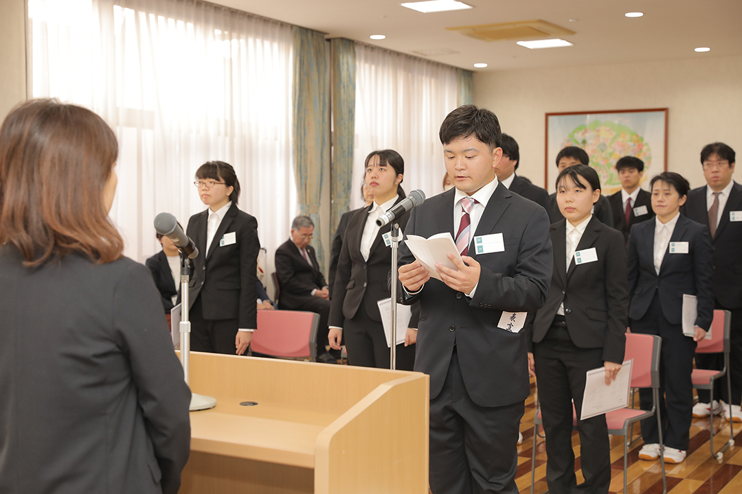 常務理事の言葉を受け、内定者の代表が「まだまだ未熟な私たちではありますが、介護福祉・教育保育への想いでは誰にも負けません。この想いをまっすぐに注ぎ、グループの発展に寄与できる人財をめざして精進していくことを、ここに誓います」と宣誓しました。