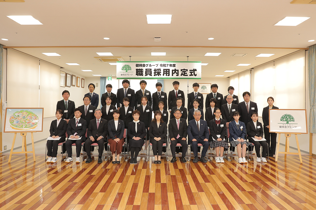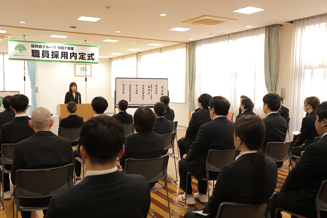11月11日、厚生労働省の定める「 介護の日」にグループの未来をともに担う新しい仲間22名を迎え、令和7年度の内定式が行われました。福祉人としての第一歩を記すにふさわしい日として、健祥会グループでは「いい日、いい日、毎日、あったか介護ありがとう」のこの日を内定式の日としています。式典では、グループ創設15周年を記念してつくられた健祥会のうた「舞踏会」の斉唱に続き、健祥会グループ常務理事中村晃子から内定証書が授与され、歓迎の挨拶がありました。