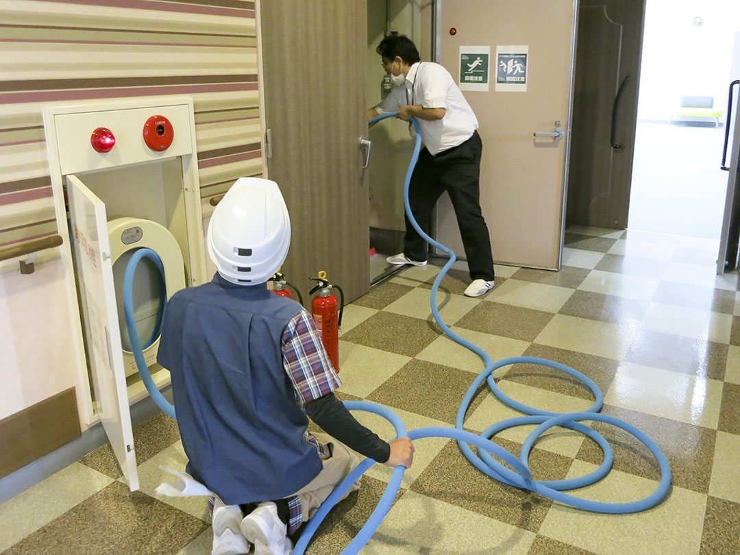 今年はコロナの禍中とあって、大規模訓練は中止となりましたが、健祥会グループ本部と健康増進施設・健祥会プレゼンテーションでは、職員の防災意識喚起と、発災時の行動確認のために、南海トラフ巨大地震想定訓練と浸水想定訓練、火災想定訓練を、密を避けて担当者レベルで実施しました。