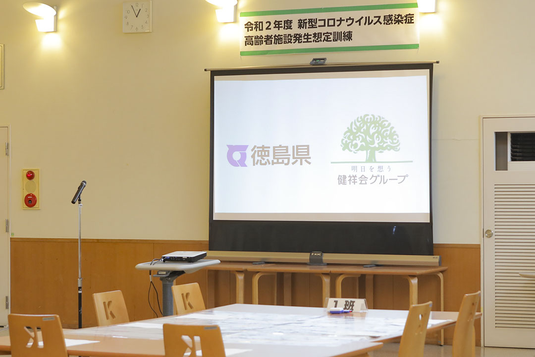 高齢者施設での新型コロナウイルス感染症発生に備える訓練が、徳島県の主催により、特別養護老人ホーム笑顔と専門学校健祥会学園を会場に行われました。徳島県から保健福祉部長寿いきがい課の重田英紀課長はじめ職員の皆さん、徳島保健所職員の皆さんがお越し下さり、看護協会や他法人の施設職員とともに、健祥会グループからは理事長中村太一ら本部役員、施設の感染予防対策やサービス継続に直接かかわる職員が数を限って参加しました。
