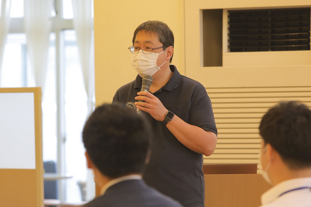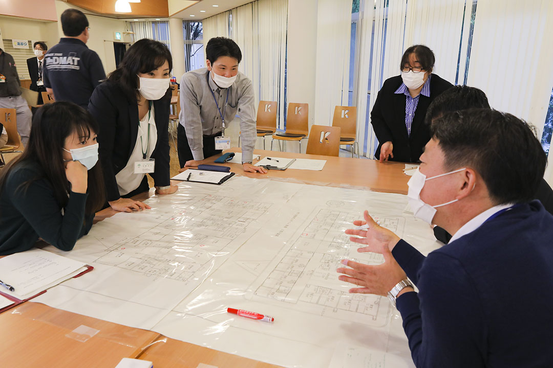 まずは、徳島県立中央病院救急科部長三村誠二先生から、クラスター発生時の対応について、ご講義をいただきました。その学びを踏まえて、図上実習へ。特別養護老人ホーム笑顔でのクラスター発生を想定し、グループディスカッションにより緻密に対応をシミュレートしました。続いて笑顔へ移動。現場を巡視し、シミュレーションの内容を丁寧に検証しました。