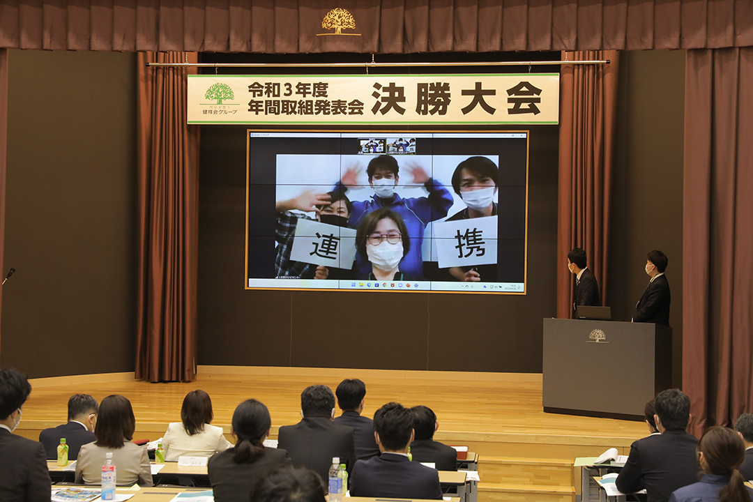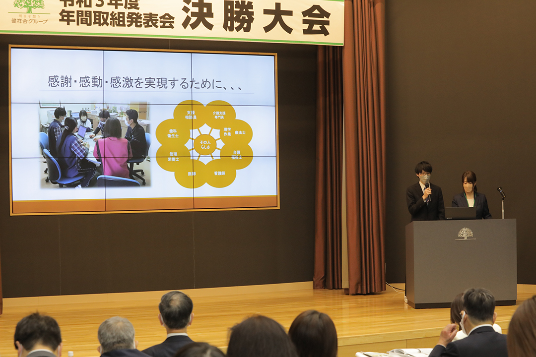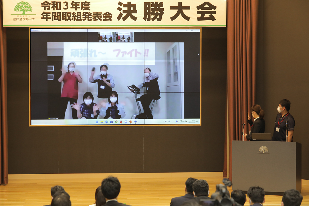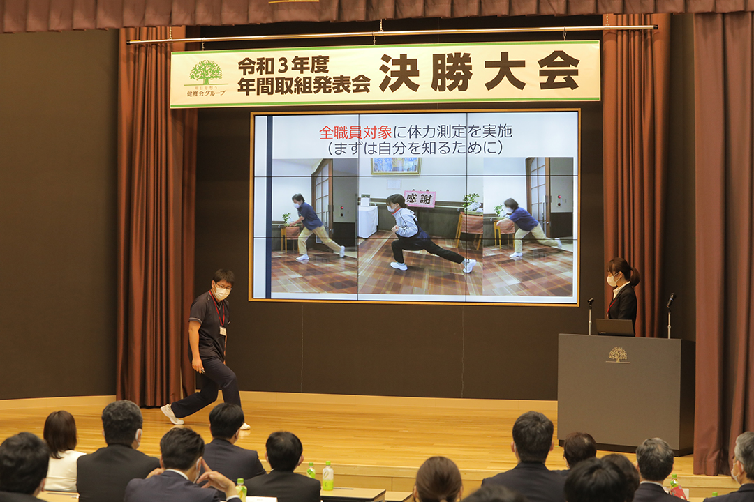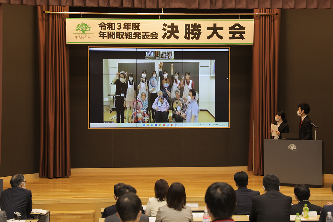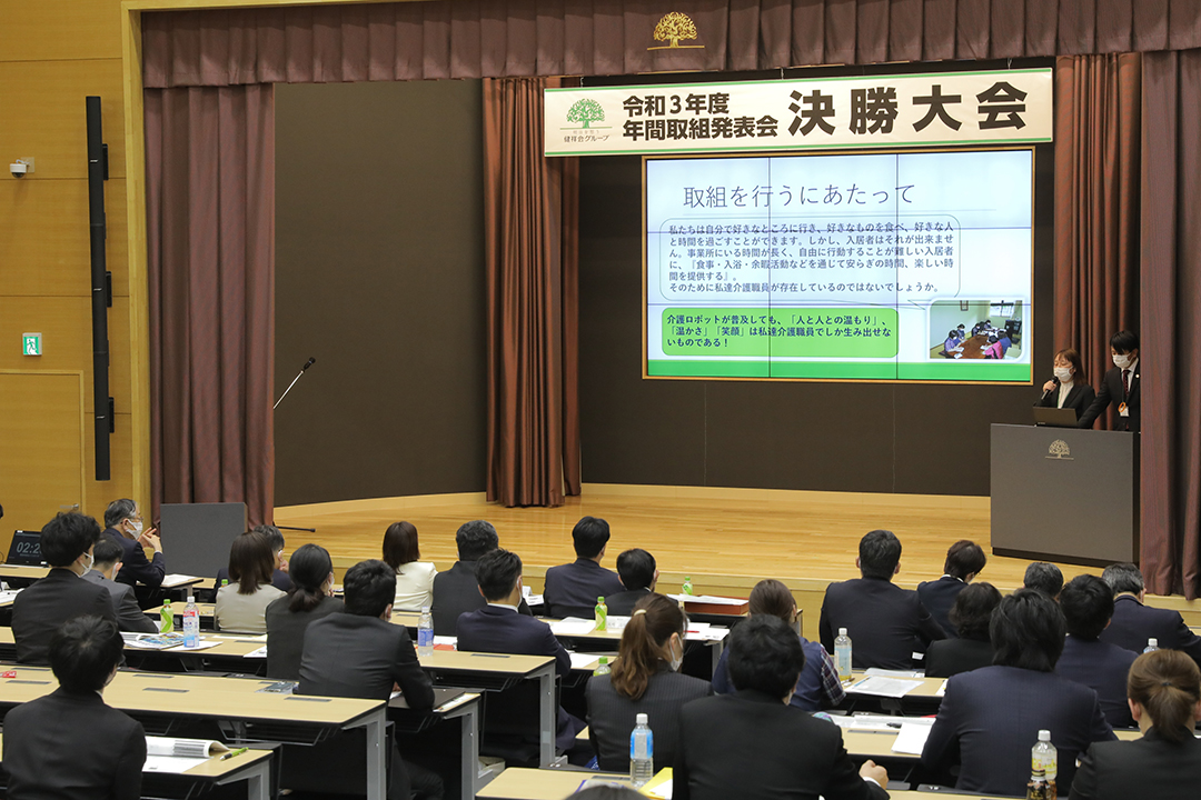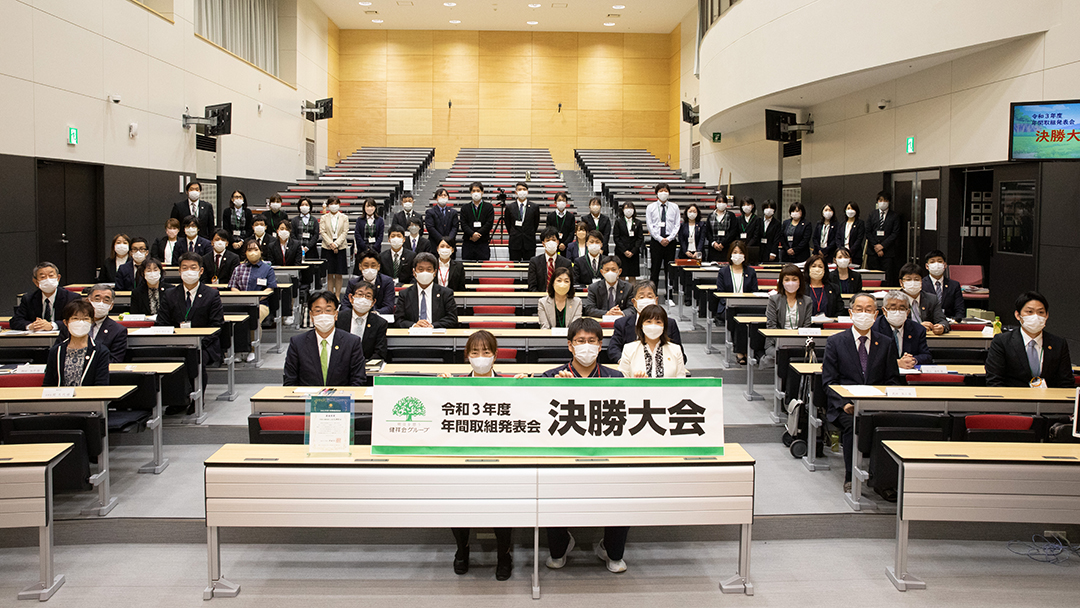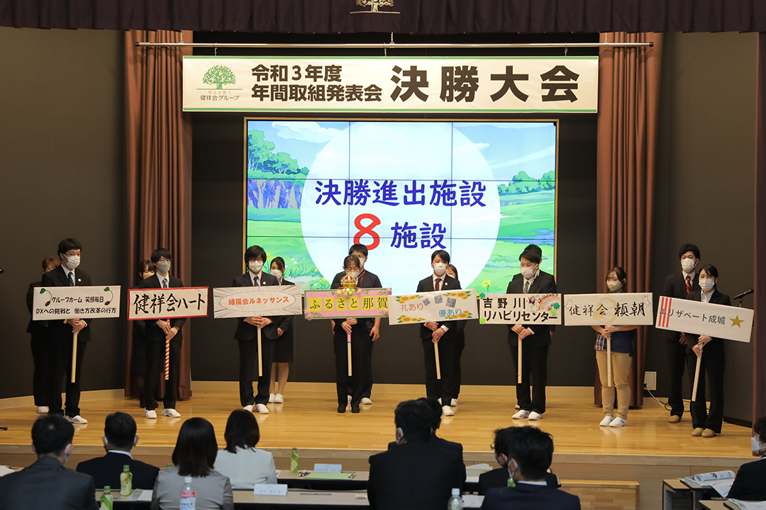 健祥会グループのすべての高齢者施設と身体障害者施設は毎年統一テーマの下に、サービス力と利用者満足度の向上のための取り組みを実践しています。その成果を報告しあい評価しあうのが「年間取組発表会」。事前に行われる施設種別ごとの予選を勝ち抜いた8施設が、健祥会トゥモローホールで開催される令和3年度の決勝大会に臨みました。