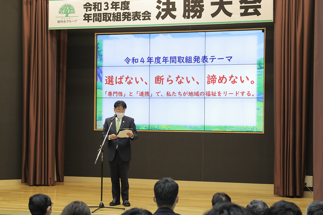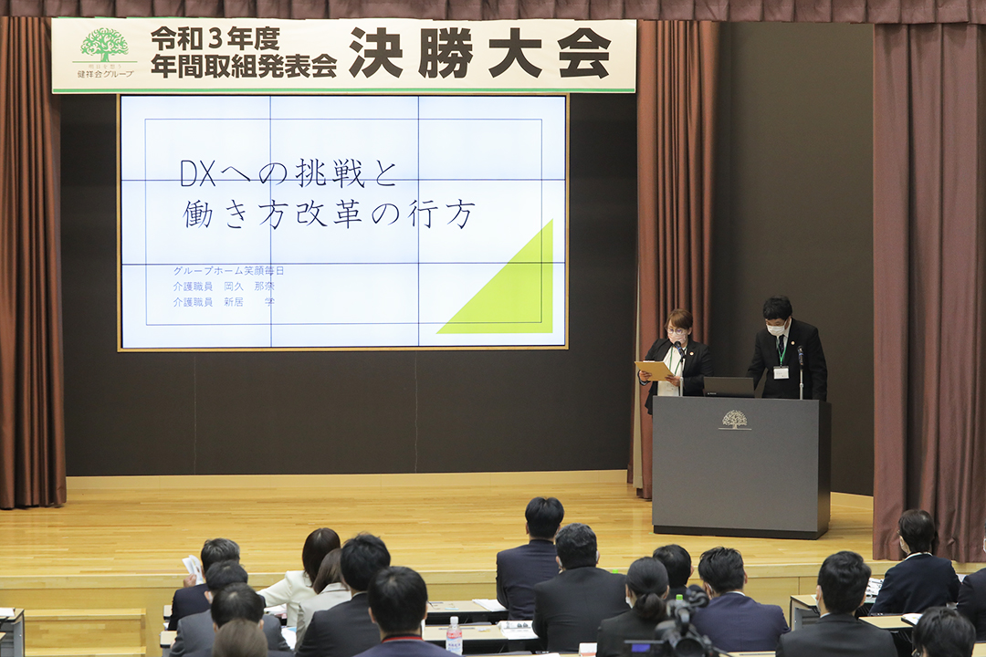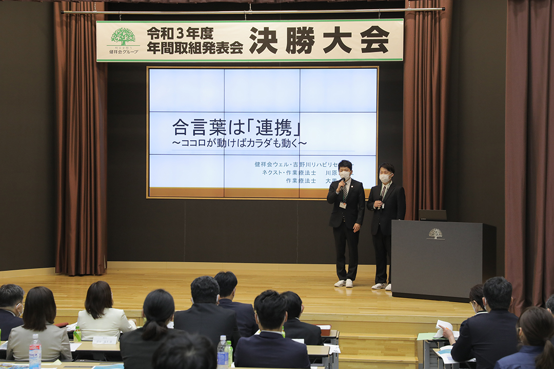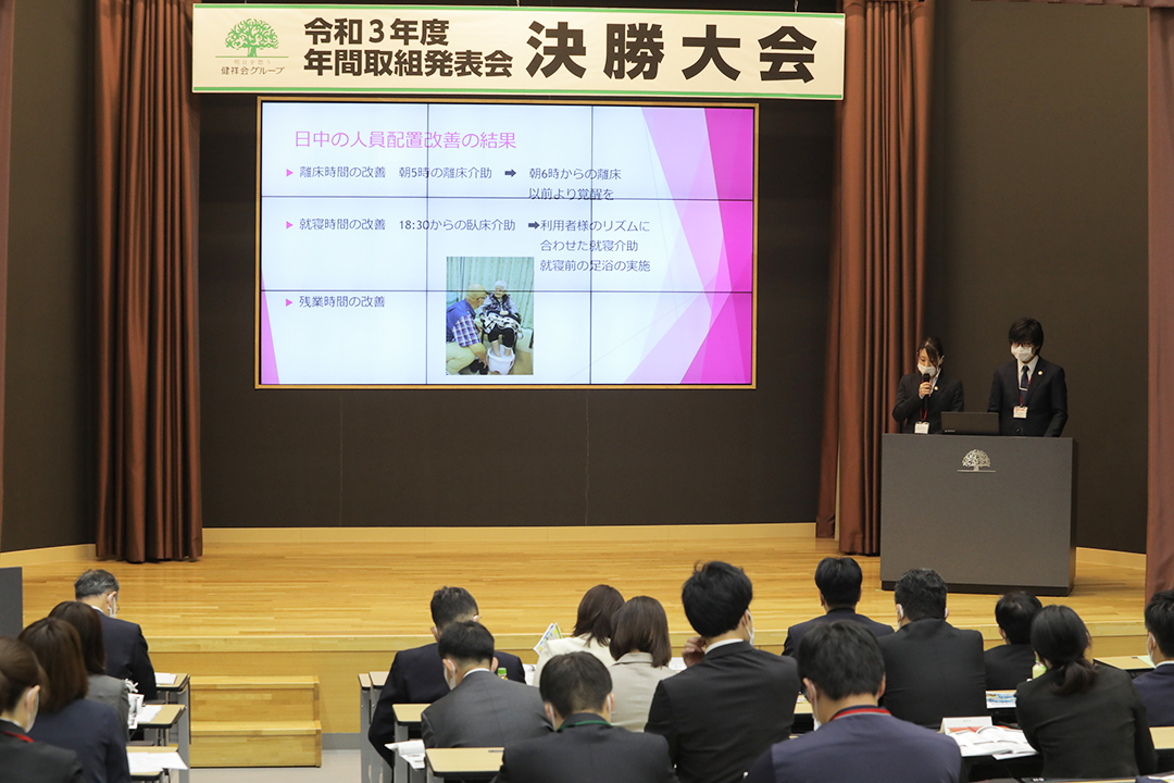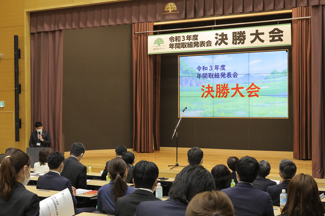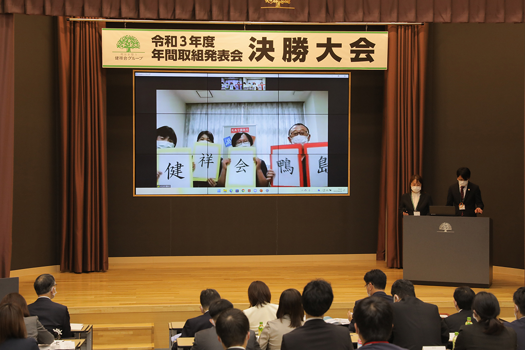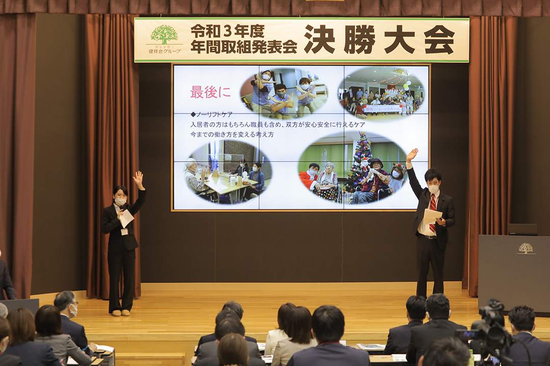 健祥会グループのすべての高齢者施設と身体障害者施設は毎年統一テーマの下に、サービス力と利用者満足度の向上のための取り組みを実践しています。その成果を報告しあい評価しあうのが「年間取組発表会」。事前に行われる施設種別ごとの予選を勝ち抜いた8施設が、健祥会トゥモローホールで開催される令和3年度の決勝大会に臨みました。