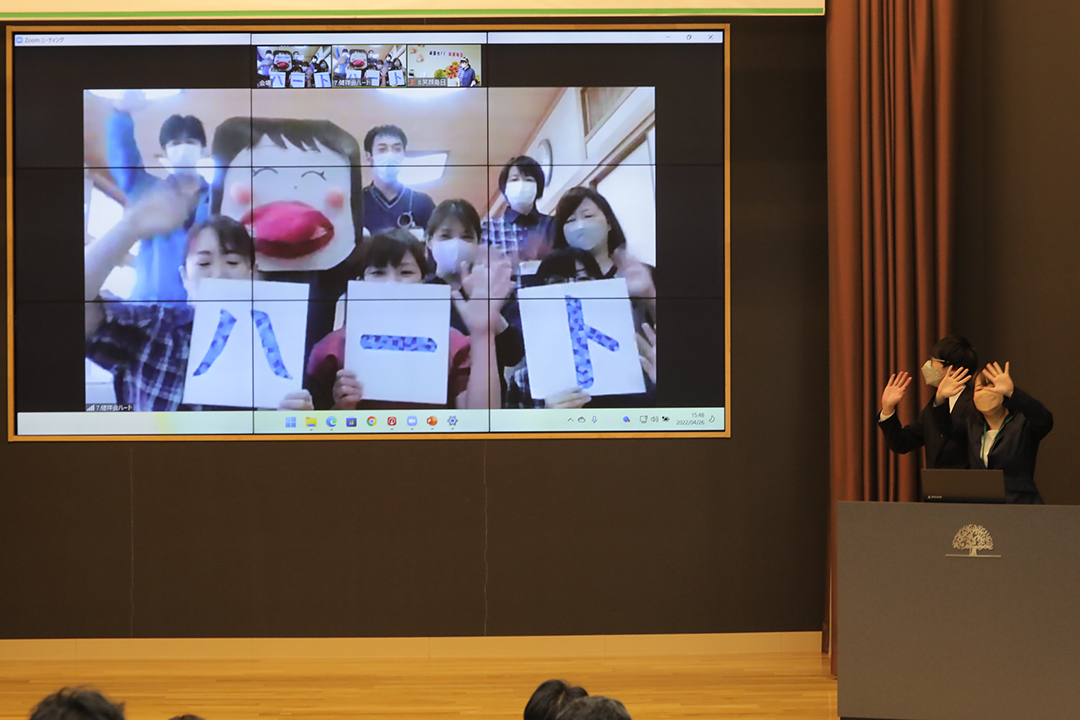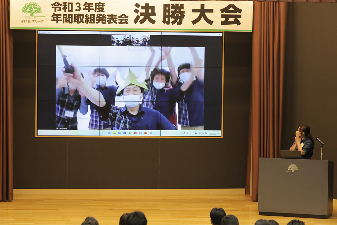 「年間取組発表会」はグループの大切なイベントです。コロナ禍にあっても中止することなく、開催方法を模索しつつ実践しています。今年も密を避け、8施設の発表者のみがトゥモローホール入り。理事長中村太一、常務理事中村晃子、専門学校健祥会学園校長武田英二をはじめ、グループ本部の管理職、ステージリーダーら審査員の前での発表とWEB会議システムによる施設からの応援で構成し、大会の模様は全施設にライブ配信されました。