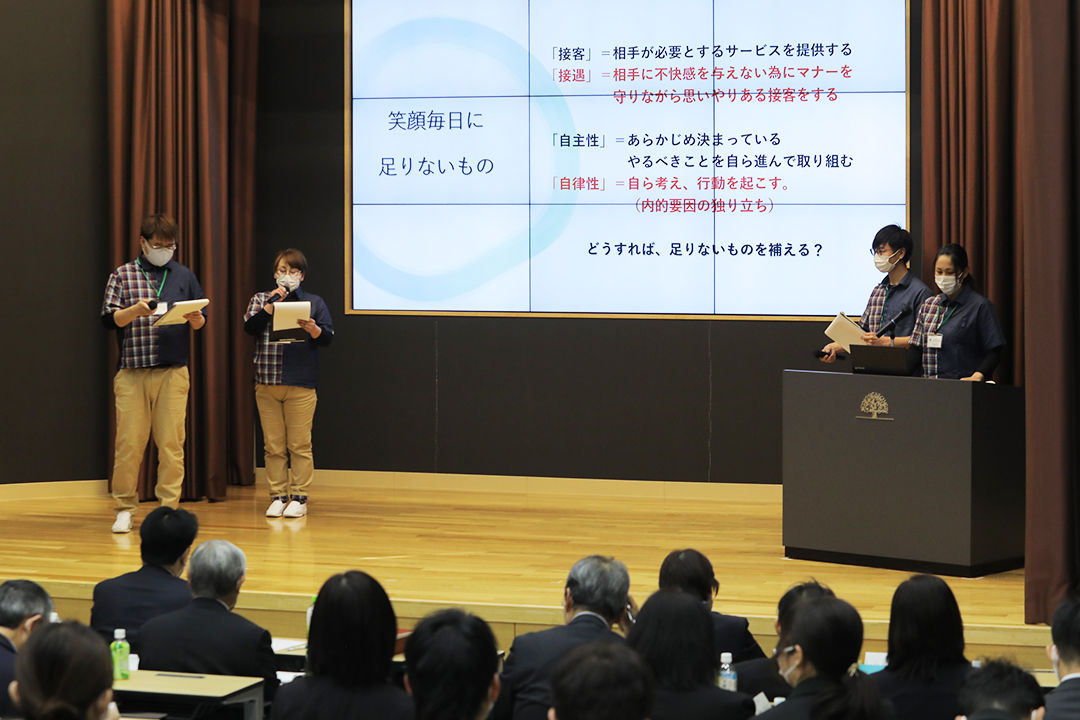 健祥会グループのすべての高齢者施設と身体障害者施設は毎年統一テーマの下に、サービス力と利用者様の満足度の向上のための取り組みを実践しています。その成果を報告し、評価しあうのが「年間取組発表会」。2020年以来、コロナの状況により開催のカタチを変えながら、それでも途切れさせることなく継続してきました。