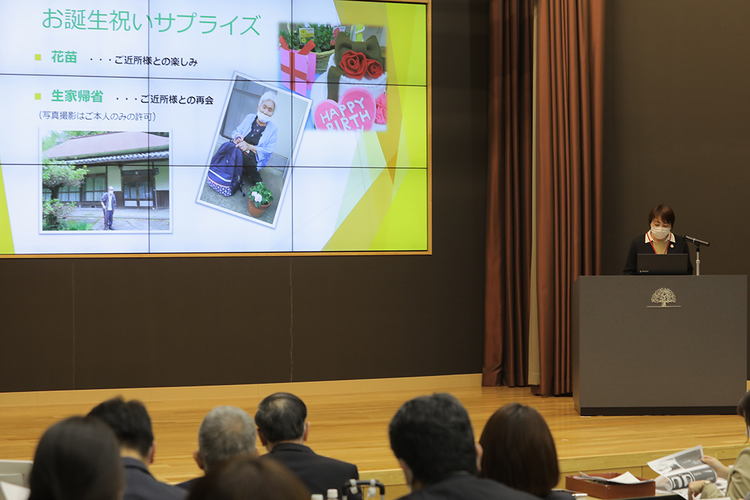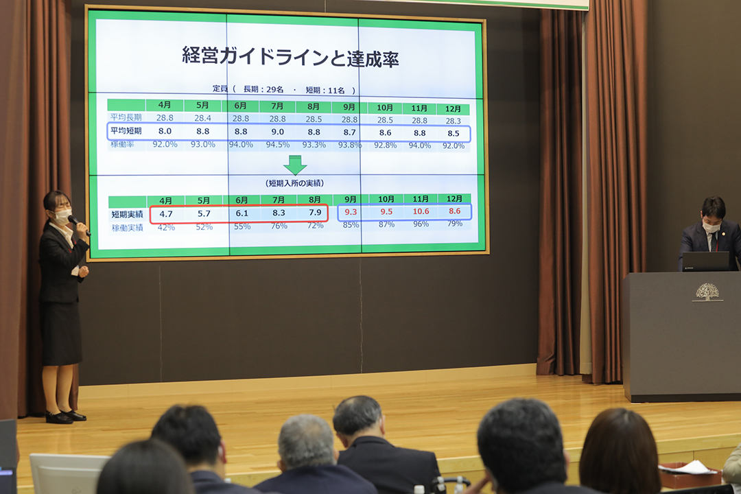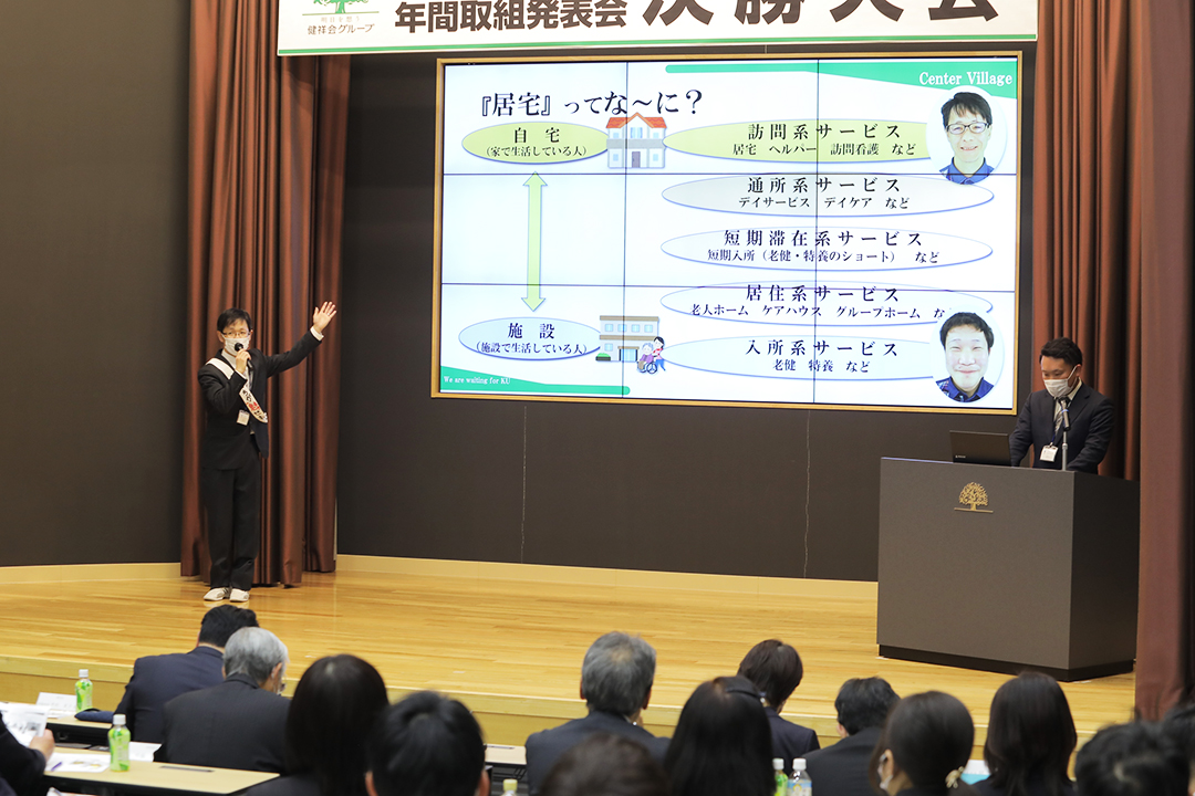 健祥会グループ理事長中村太一、健祥会グループ常務理事中村晃子、専門学校健祥会学園校長武田英二をはじめ、社会福祉法人緑風会監事佐藤茂夫、社会福祉法人緑風会・青嵐会評議員西山惠子、グループ本部の管理職、施設長の中から選任されるステージリーダーらが審査員となって、職員の前で、1年間頑張ってきた取り組みと成果がプレゼンテーションされました。コロナ禍の中、7施設の発表者と応援団、すべてがホールに揃うのは4年ぶりです。大会の模様はWEB会議システムでグループ全施設にライブ配信されました。利用者様も楽しみに画面の前で応援してくださっているとのこと、発表にも力が入りました。