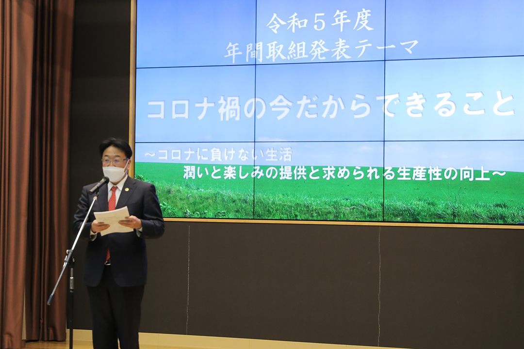 令和5年度のテーマは、「コロナ禍の今だからできること~コロナに負けない生活 潤いと楽しみの提供と求められる生産性の向上~」です。全施設・全職員が1年頑張って、さらに素晴らしい成果を報告してくれることを期待したいと思います。