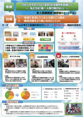 コロナ禍で希薄となった地域との関わりを取り戻すため、子ども食堂のお手伝い、地域交流ホールの貸し出しや中学生の職場体験再開、介護教室をはじめ、地域交流ホールでの入居者様向けのミニデイサービスなどに取り組んだ。また、入居施設としての機能だけでなく、在宅生活の継続を支援するという視点から、言葉を発せない利用者様の表情から希望を読み取り挑戦した外泊。「24時間暮らしの支援シート」を活用し、多職種が連携して実現できたことで、在宅復帰支援への大きな手応えと経験になった。