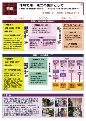 「町の福祉をリードする中心施設として、大切な人をお守りする!」この想いを共有し、居宅と施設がケアプランを通じて「連携」するとともに「専門性」のアップデートを図った。利用者様の想いに応えた「選ばない・断らない・諦めない」実践例。施設内zoomで連携を確認し励まし合いながら取り組んだクラスター対応は「諦めない」取り組みそのもの。よい看取りのために実施した心づもりと名付けたアンケート、ご家族へのグリーフレターなど、利用者様の人生とご家族の心に寄り添った支援に繋がった。
