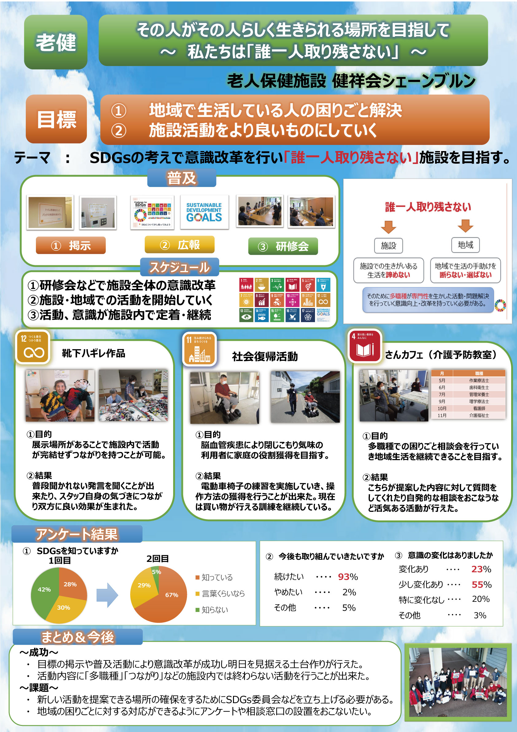 「町の福祉をリードする中心施設として、大切な人をお守りする!」この想いを共有し、居宅と施設がケアプランを通じて「連携」するとともに「専門性」のアップデートを図った。利用者様の想いに応えた「選ばない・断らない・諦めない」実践例。施設内zoomで連携を確認し励まし合いながら取り組んだクラスター対応は「諦めない」取り組みそのもの。よい看取りのために実施した心づもりと名付けたアンケート、ご家族へのグリーフレターなど、利用者様の人生とご家族の心に寄り添った支援に繋がった。