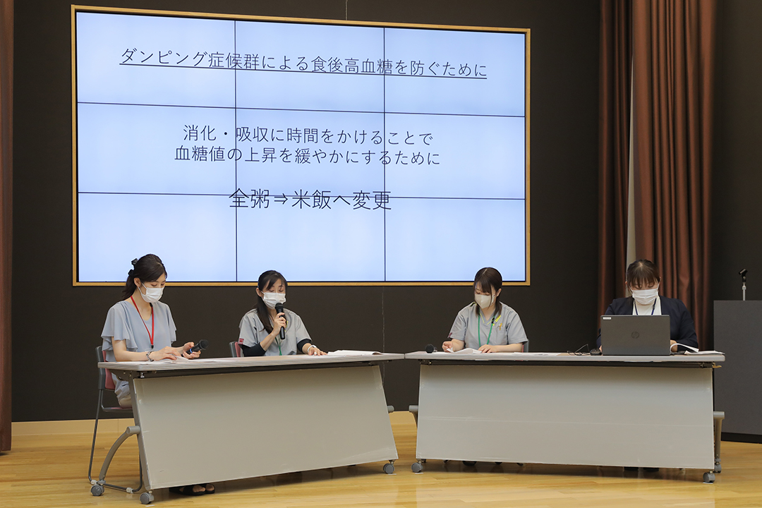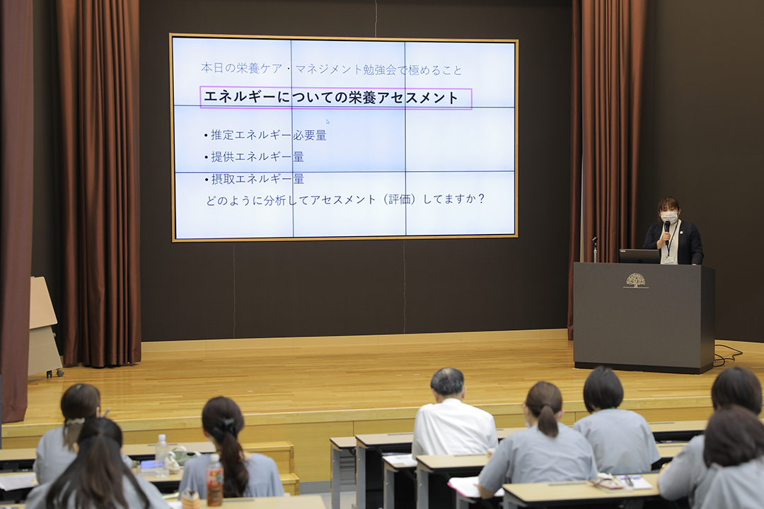 その一環として、勉強会を企画。利用者様の状態に応じた栄養管理のために重要となるアセスメントの基本を確認するとともに、意見交換と学びの機会として開催しました。健祥会トゥモローホールを会場に、リアル参加25名、リモート17名、合計42名の参加です。