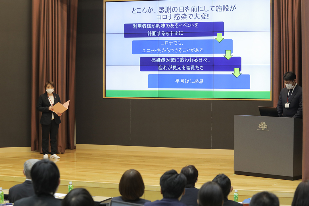 コロナ禍で薄れてしまった利用者様とご家族、ご家族と施設とのつながり。ポストコロナの今、安心な日常を維持しながら、このつながりを取り戻し、よりあたたかなものとするためにユニットごとに取り組んだ4つの事例が紹介された。「私という物語」を生きる一人ひとりに向き合った「個別ケア」への喜びと手応えを得た取り組みだった。